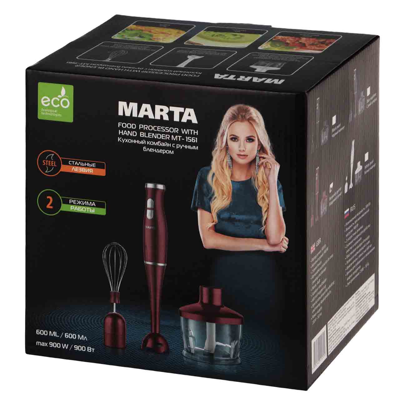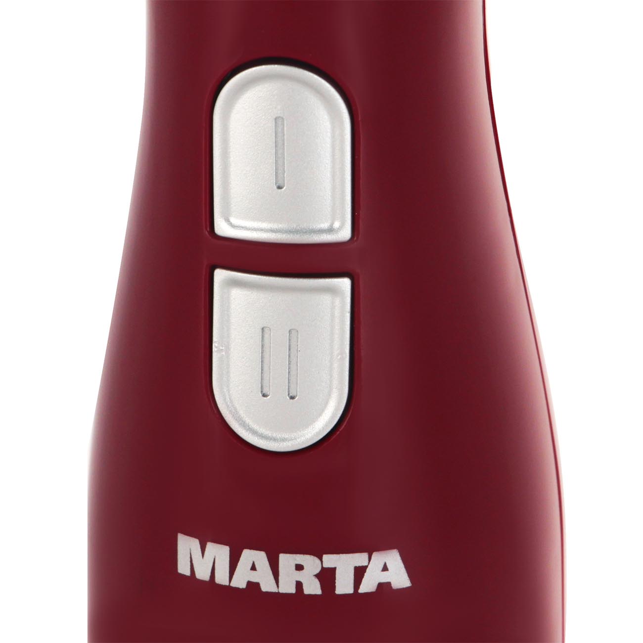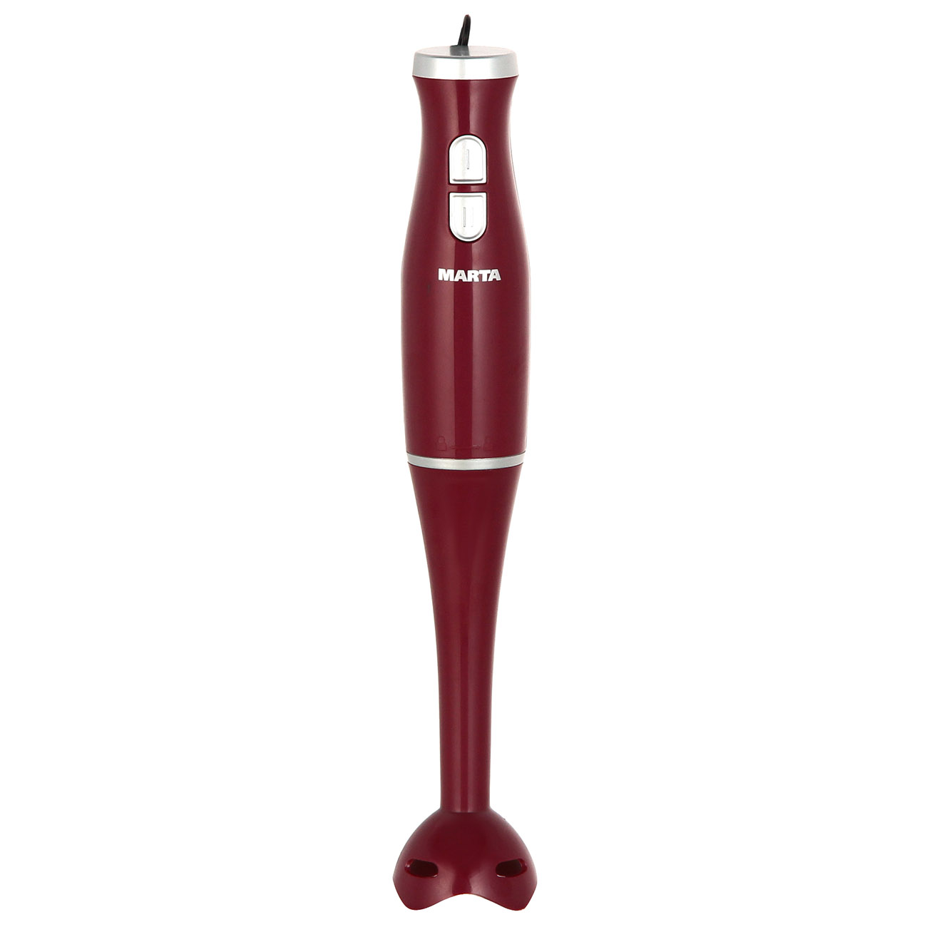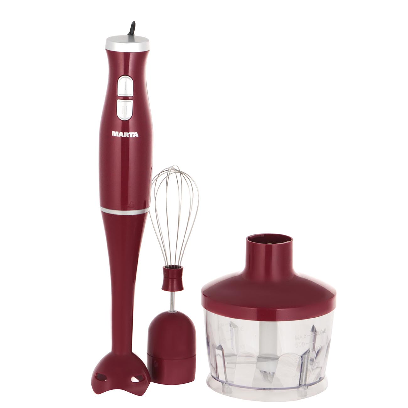 С блендером Marta MT-1561 самые трудоёмкие и утомительные кулинарные задачи будут отнимать у вас значительно меньше сил и времени. Благодаря 300-ваттному мотору прибор за считаные секунды взбивает, измельчает и смешивает продукты. В этом ему помогают входящие в комплект насадки.