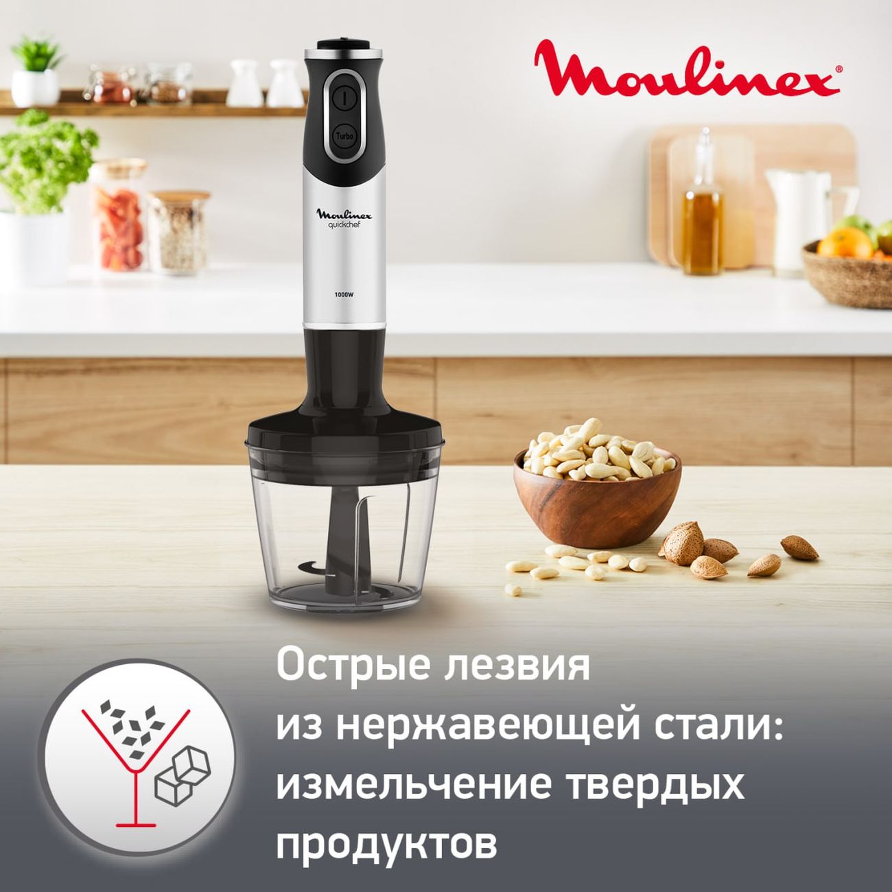 Работает, много насадок: блендер погружной с 4 лезвиями (надеюсь долго прослужит внутренний стержень), Две чаши для измельчения / перемешивания, одна небольшая, другая большая и с ней можно нарезать овощи и фрукты, как в комбайне разными тёрками / ножами. Венечек. В принципе довольны.