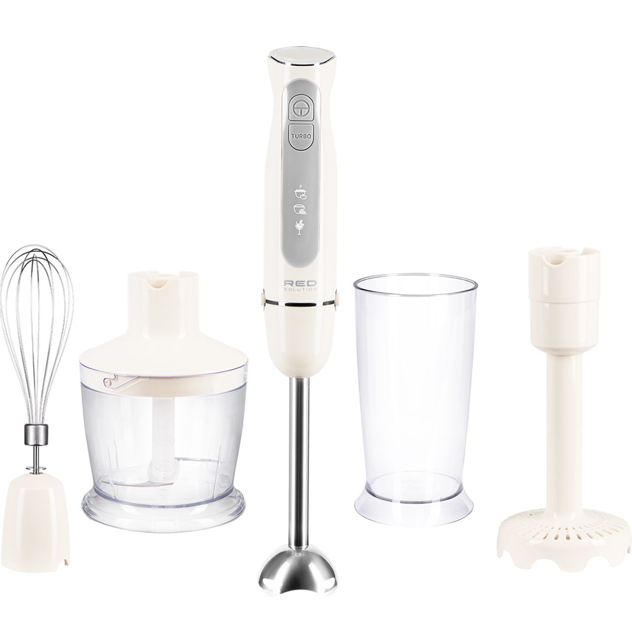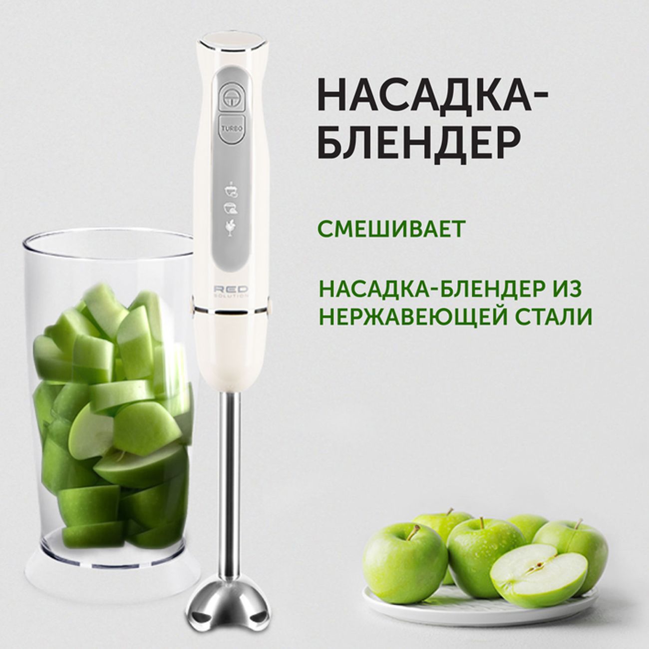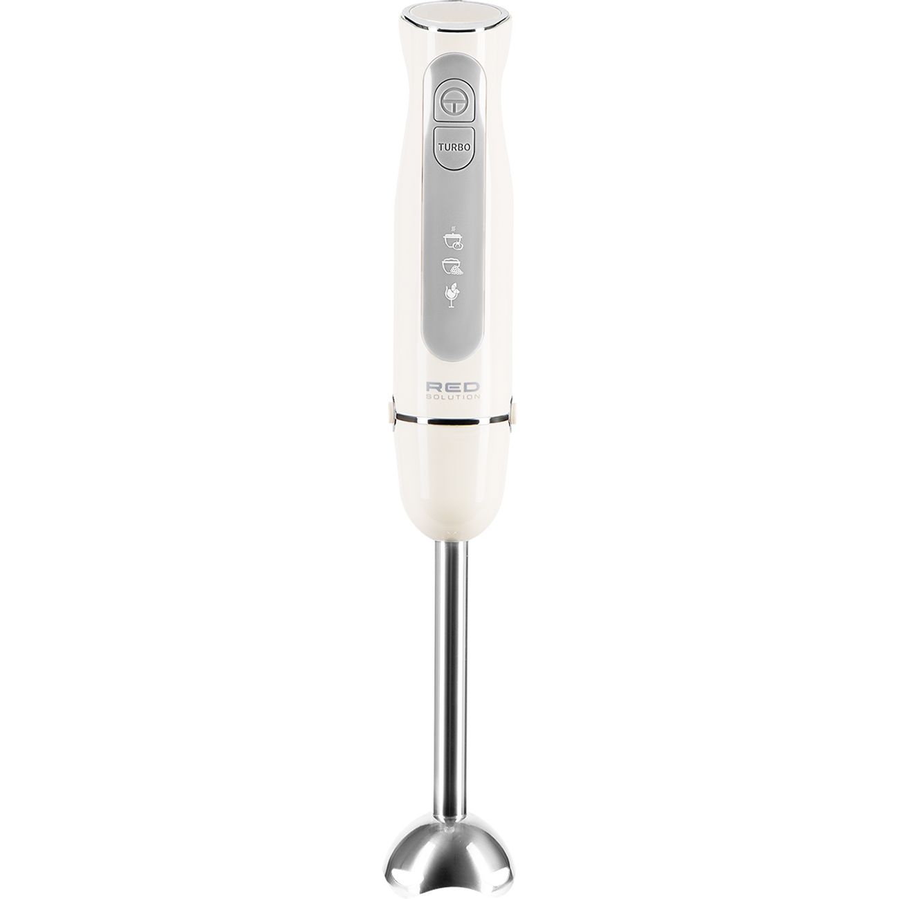 Погружной блендер Red Solution RHB-2994 бежевого цвета обладает габаритами 39,6х6х5,7 см. Масса модели — 1,75 кг. В комплекте поставляются S-образный нож, также три насадки. Емкость мерного стакана составляет 0,6 л. Лезвие выполнено из нержавеющей стали, корпус — из пластика. Устройство может работать в турборежиме. Уровень мощности не превышает 1,3 кВт.