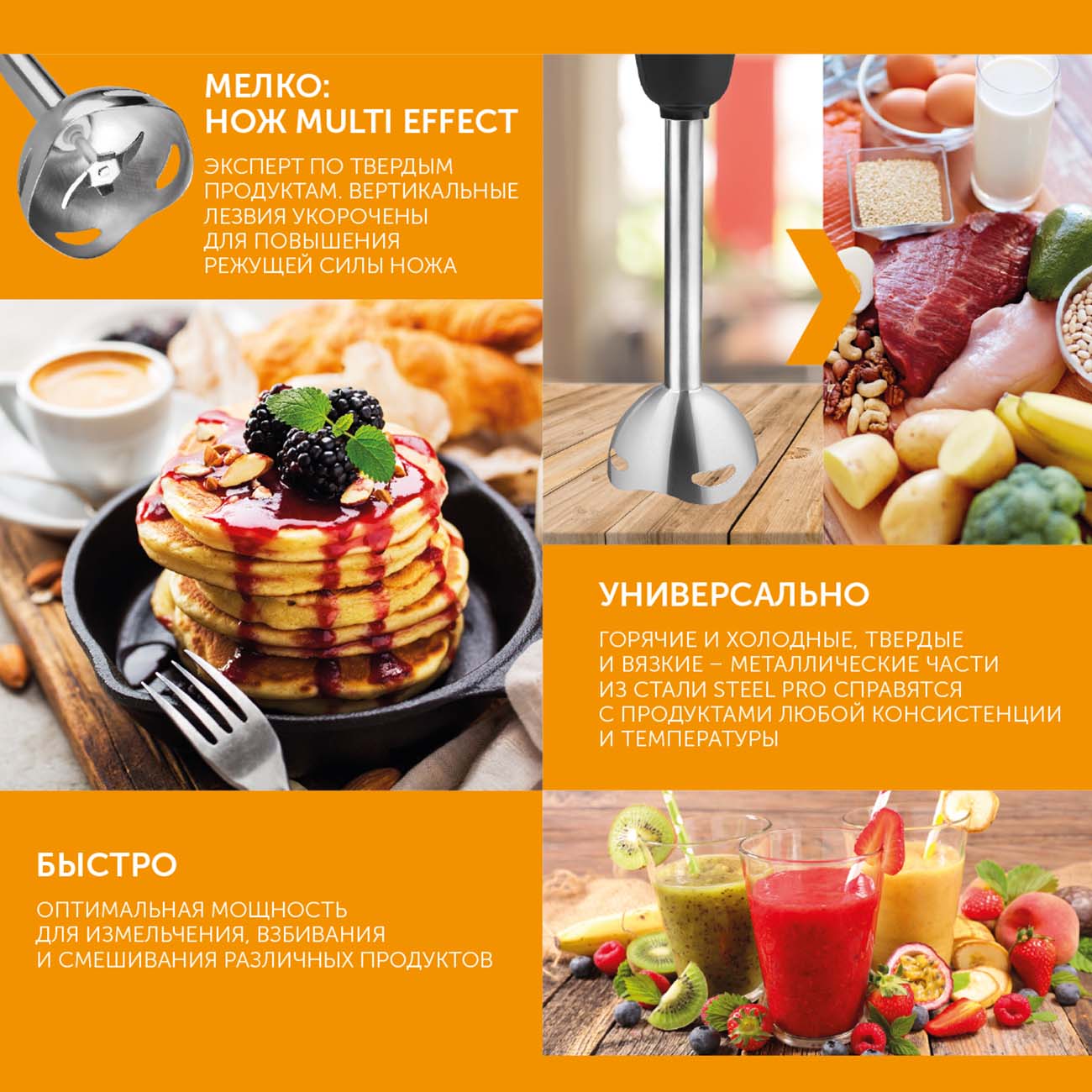 Погружная часть блендера выполнена из металла, она не боится коррозии. Лезвия изготовлены из прочной нержавеющей стали, они легко справляются с измельчением мяса, твёрдого сыра, орехов.