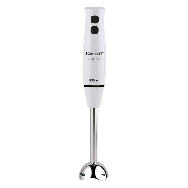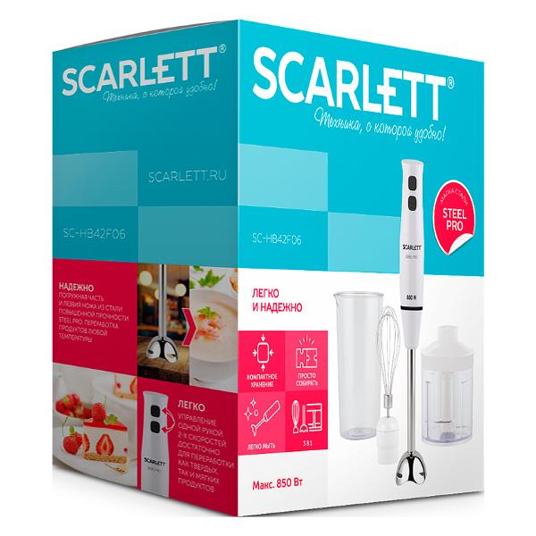 Блендер погружного типа Scarlett SC-HB42F06 белого цвета обладает габаритными размерами 370х50х50 мм. Модель комплектуется мерным стаканом объемом 700 мл и тремя насадками. Венчик обеспечивает взбивание жидких ингредиентов, насадка-блендер и чоппер позволяют переработать продукты различной твердости и размеров. Чоппер объемом 500 мл выполнен из пластика. Возможна мойка насадок в посудомоечной машине.