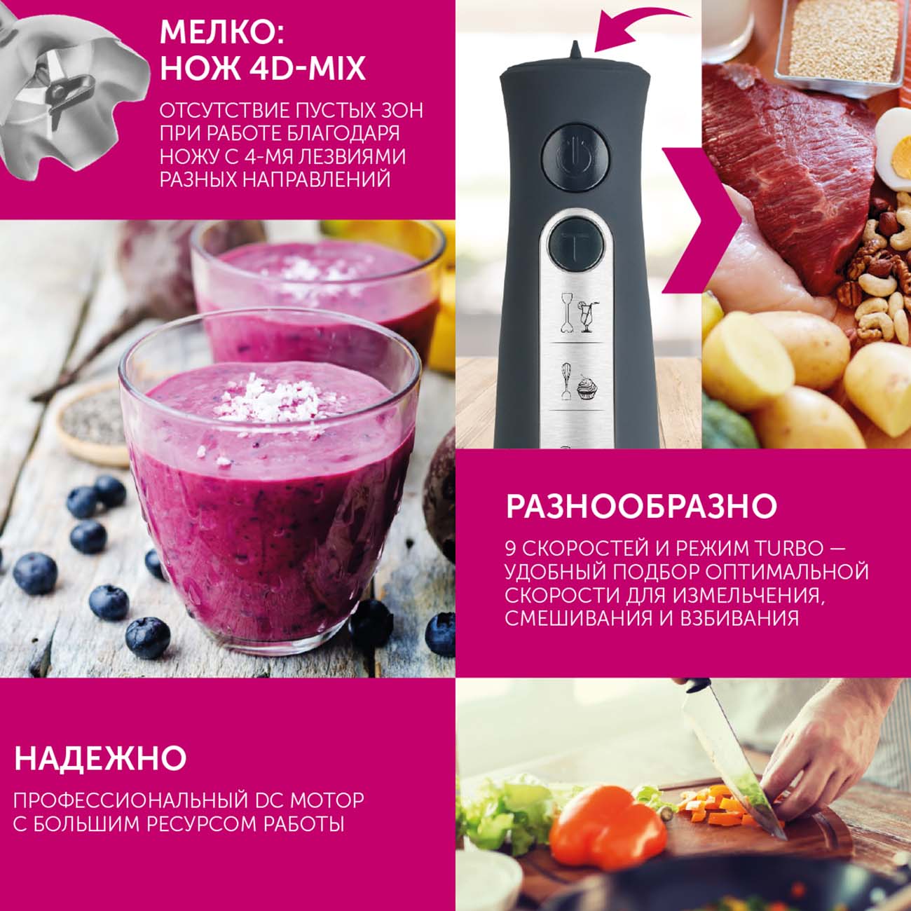 В этой модели применяется нож, изготовленный по технологии 4D: у него четыре лезвия, изогнутых в разных направлениях, поэтому при его использовании не образуется мёртвых зон, и он отлично захватывает продукты.