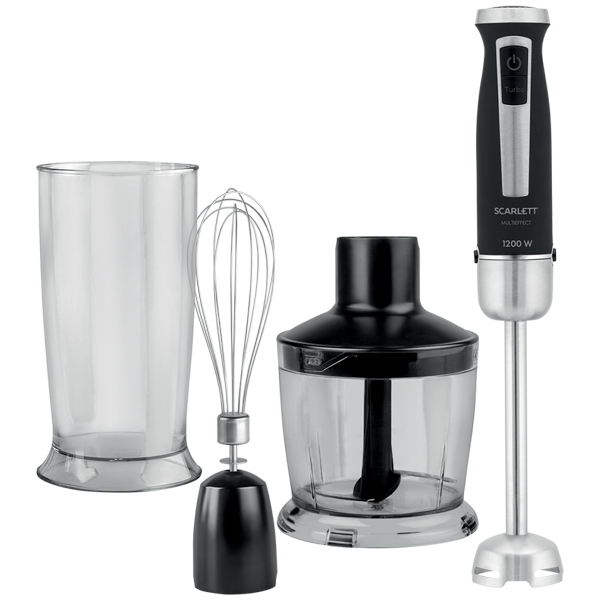 Погружной блендер Scarlett SC-HB42F59 изготовлен в серебристо-черном цвете. Скорость вращения насадок — 15000 оборотов в минуту. Длина сетевого кабеля — 1,1 м. Максимальная мощность — 1200 Вт. Объем измельчительной чаши составляет 500 мл. Управление механическое. Есть функция «Турборежим» и «Плавный старт». Модель работает на 20 скоростях. В комплекте поставляется мерный стакан на 600 мл, стандартная насадка-измельчитель и венчик для взбивания жидких смесей. Корпус сделан из пластика, погружная часть — из стали, устойчивой к коррозии и деформациям. Габариты модели: 39х5,3х5 см. Вес — 1,25 кг.