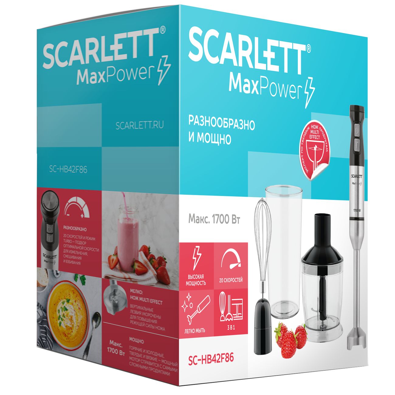 Погружной блендер Scarlett SC-HB42F86 оснащен мотором 1700 Вт. Кнопочная система управления позволяет выбрать один из 20 уровней скорости или воспользоваться режимом «Турбо».