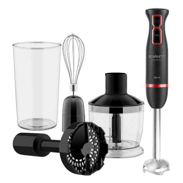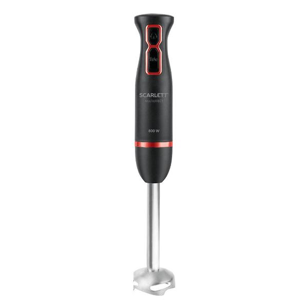 Погружной блендер Scarlett SC-HB42M44 в черном корпусе украшен элементами красного цвета. Модель потребляет 800 Вт электроэнергии. У блендера два скоростных режима, присутствует кнопка Turbo. Скорость вращения двигателя составляет 15000 об/мин. Встроенная защита исключает риск перегрузки и перегрева.