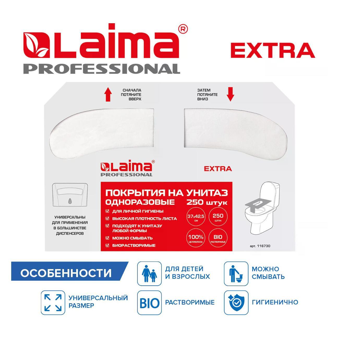 Универсальный размер. Сочетаются с диспенсерами других производителей. Предназначены для одноразового использования. Подходят к унитазам любой формы. Изготовлены из 100% целлюлозы белого цвета. Тип сложения – 1/2. В упаковке 250 покрытий для унитаза. Размер листа – 37х42,5 см.