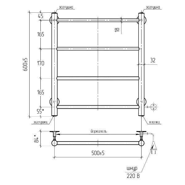 Хромированный электрический полотенцесушитель «Свободный бренд» 45 PSK-VMRKe56Cr выполнен из нержавеющей стали и дополнен электропроводом с вилкой. Модель оформлена в форме лесенки с четырьмя перекладинами и правым боковым подключением. Устройство питается от сети, потребляет 100 Вт и обеспечивает теплоотдачу 180 QВт. Весит конструкция 3,3 кг.