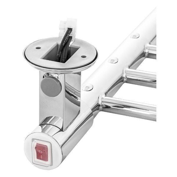 Полотенцесушитель оснащен кабелем питания длиной 150 см. Снизу установлена кнопка включения и отключения устройства. Есть защита от влаги и пыли стандарта IP44. Нагрев до рабочей температуры осуществляется примерно за 5-10 мин. В комплекте идут шурупы и дюбели для монтажа. Высота — 940 мм.