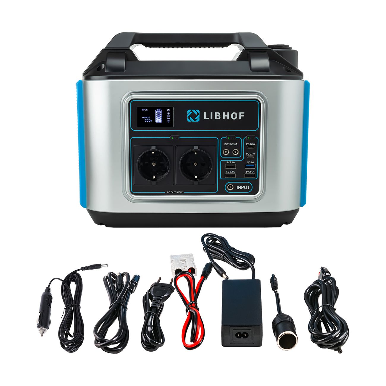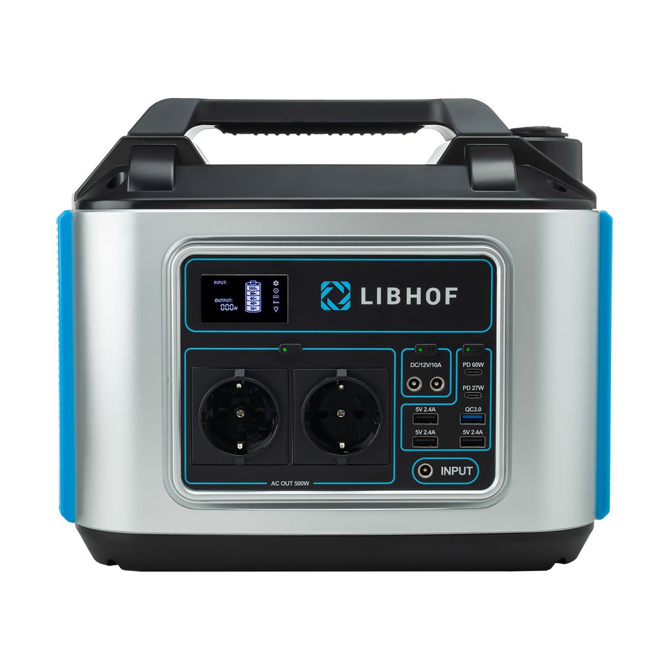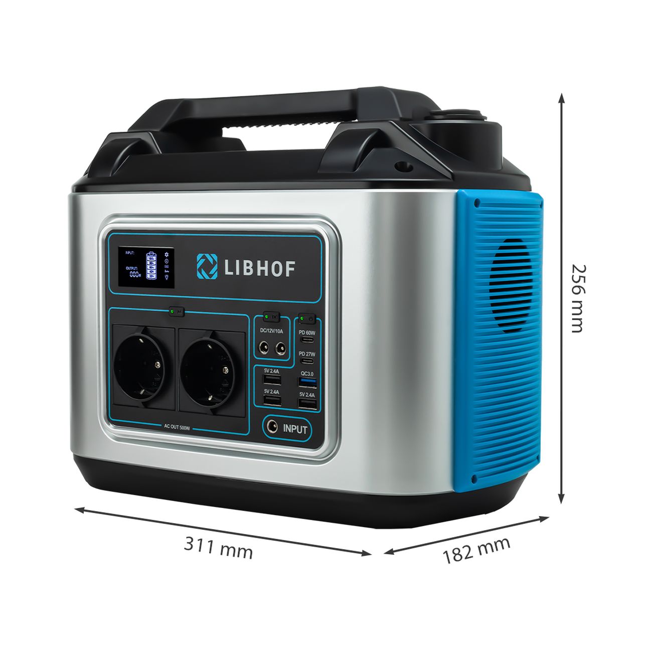 Портативная электростанция Libhof PPS-500 серого цвета с черными элементами обладает массой 6 кг. Габариты устройства — 31,1х25,6х18,2 см. Длина встроенного кабеля — 1,5 м. Корпус закрытого типа выполнен из пластика. Встроен фонарик. На лицевой стороне размещаются индикаторы заряда аккумулятора и уровня зарядки. Прибор обладает интерфейсами USB Type-C, USB 2.0 тип А, microUSB 2.0.