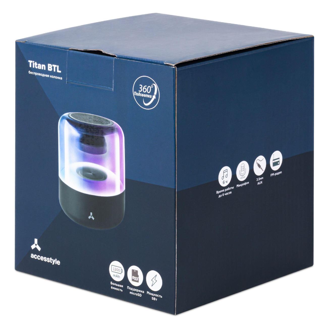 Портативная акустика Accesstyle Titan BTL черного цвета обладает массой 470 г. Габариты модели составляют 134х114х114 мм. Суммарная мощность устройства — 5 Вт. В комплекте поставляется кабель USB. Корпус изготавливается из пластика и защищен от брызг. Присутствует подсветка. Емкость аккумулятора — 1200 мА*ч. Прибор оснащается встроенным микрофоном.