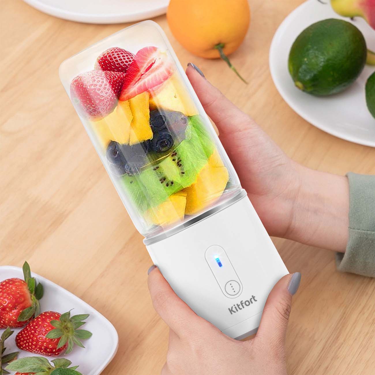 Забарала вчера. Блендер на вид ну очень милый. Дизайн супер. Есть встроенный аккумулятор, что очень удобно. Не нужно постоянно таскаться с зарядкой и быть привязанным к розетке.чаша стекло. сама чаша хоть и небольшая, но на порцию самое то. Включение двумя нажатиями. Выключение олним нажатием. При работе подсвечиваеися индикатор. Свет индикатора красивый, бирюзовый. Радует глаз. Места занимает мало, очень компактный, даже оставив его на столе, он не будет мешать. В дороге думаю единственный минус это его вес (тяжеловат, но это из-за стеклянной чаши). Пластиковая часша понятно, была была бы лечче, но вот стекло как-то приятнее и натуральнее чтоли... По поводу заявленной функции колка льда-сомнительно, т.к. Стекло может треснут, да и ножи сомневаюсь, что выдержат, хотя... Ножа 4. 2 гладких и 2 ребристых, видимо как рпз для льда. Может не крупные кусочки льда и возьмет. Но я не пробовала лед, так что утверждать не могу. Шумит в меру. Но нащвать его совсем тихим не получится. Измельчает нормально. Скорость вращения и раскрутки впечатляет. Только загрузишь все ингридиенты и включишь, прям цунами))) и после остановка еще крутит в центре волну... Вообщем, мои впечатления самые позитивные. Посмотрим как поведет себя далее в эксплуатации. Сыну 11 лет, понравился. Прост в управлении. Что важно, можно мыть в посудомойке чашу. Пластик мог бы со временем помутнеть или пожелтеть. Хотя при неаккуратном использовании и стекло можно разбить. Минус, что нет крышечки, но справедливости ради, надо сказать, что она и не заявлена в данной модели. Хотя, думаю в производстве это не столь затратный момент, можно и доработать. За жту цену просто подарок. Советую к покупке.