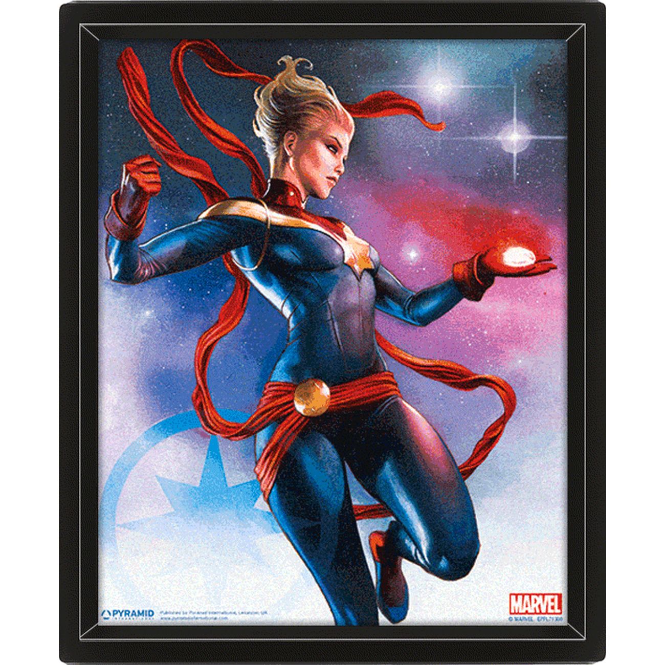 Плакат Pyramid вызовет интерес у поклонников супергеройских приключений. Он изображает Капитана Марвел, которая парит в космосе, в её раскрытой ладони лежит светящийся предмет. Оригинальный постер придаст индивидуальность комнате и подчеркнёт увлечения своего владельца.