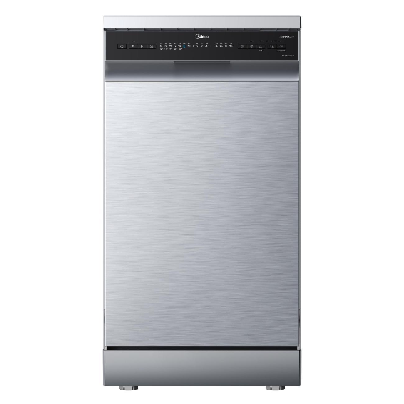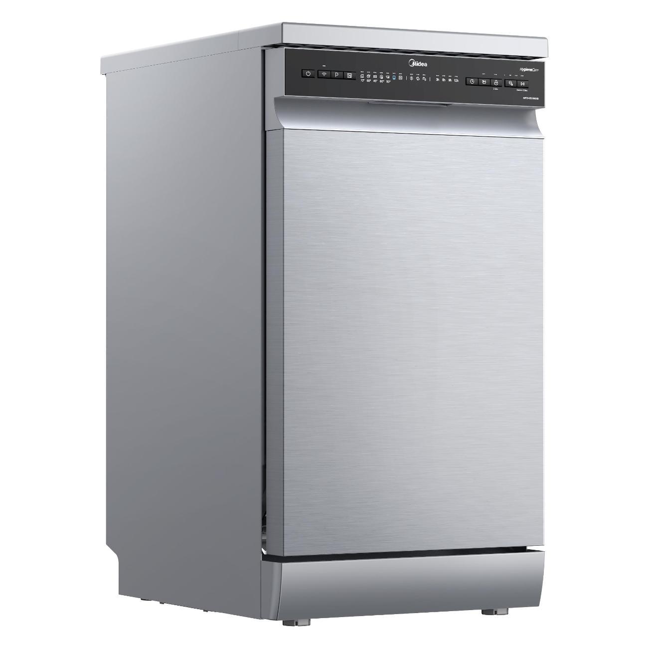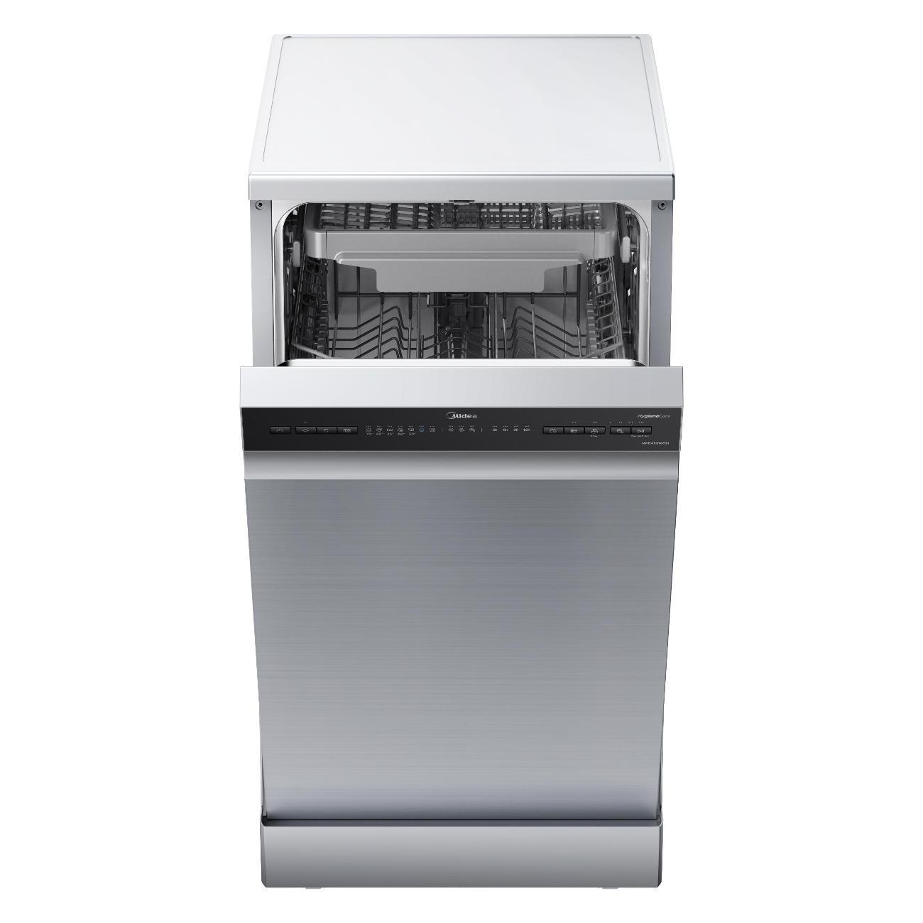 Посудомоечная машина Midea MFD45S160Si, серебристая — отдельностоящая узкая модель, вмещающая до десяти комплектов. Энергопотребление прибора соответствует классу А, за цикл расходуется 0,9 кВт*ч и тратится 9 л воды. Уровень шума при работе достигает 49 дБ.