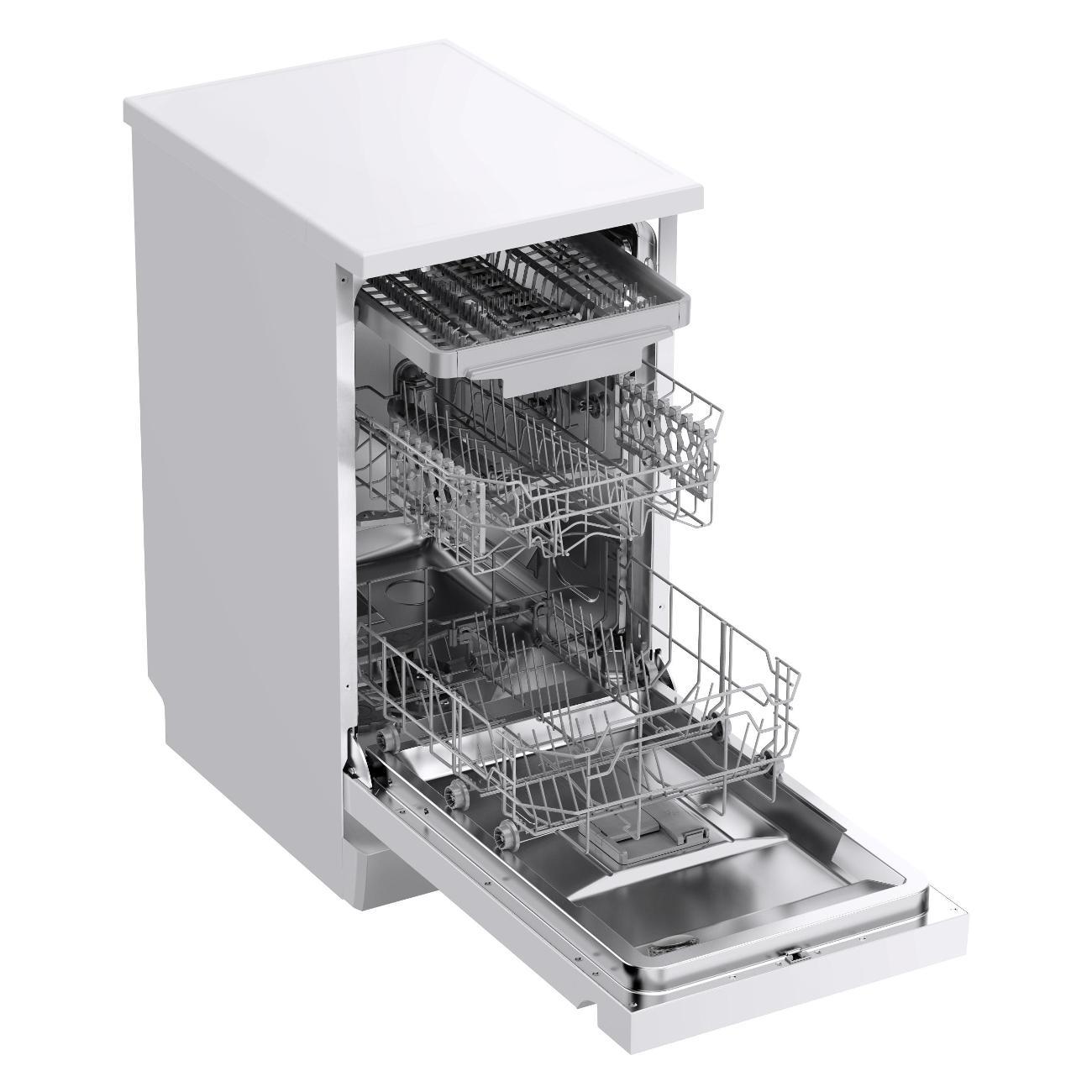 Посудомоечная машина Midea MFD45S160Wi, белая — отдельностоящая узкая модель, вмещающая до десяти комплектов. Энергопотребление прибора соответствует классу А, за цикл расходуется 0,9 кВт*ч и тратится 9 л воды. Уровень шума при работе достигает 49 дБ.