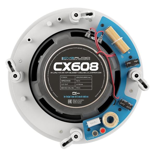 Потолочная колонка Cvgaudio CX608 — встраиваемая акустическая система с номинальной и максимальной мощностью 40 и 80 Вт соответственно. Количество полос — две. Поддерживаемый частотный диапазон — от 50 Гц до 20 кГц. Уровень сопротивления равен 8 Ом, чувствительности — 88 дБ. Высокочастотный излучатель обладает формой купола, материалом для его изготовления выступает шелк. Среднечастотный и низкочастотный излучатели выполнены из полипропилена, размеры каждого из них составляют 16,5 см.