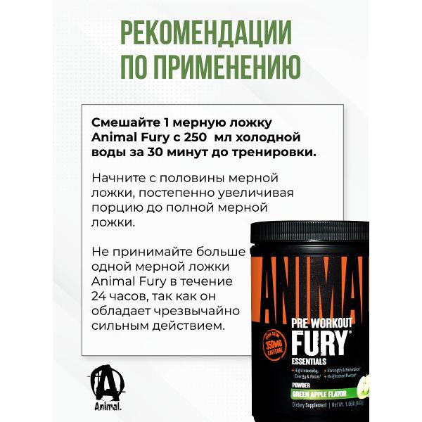 Предтренировочный комплекс Animal Fury представлен в упаковке, рассчитанной на 30 приемов. Одна мерная ложка смешивается с холодной водой за полчаса до тренировки. Перед началом употребления БАДов рекомендуется проконсультироваться с лечащим врачом.