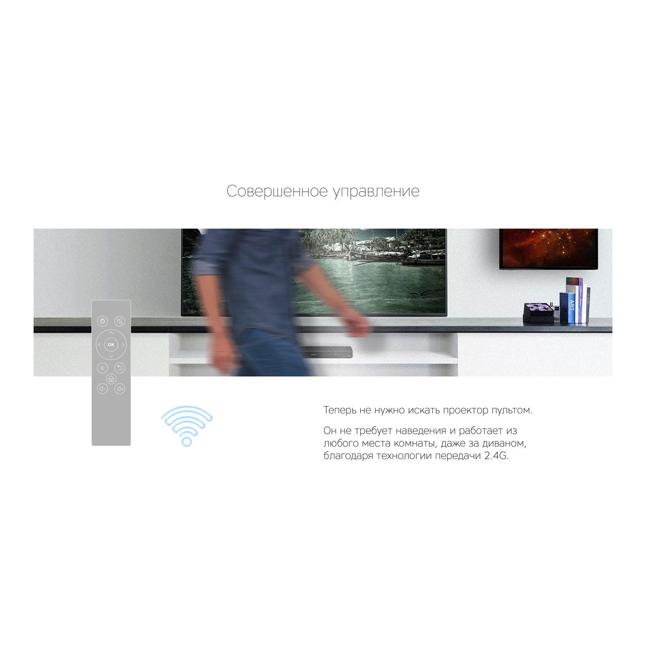 В комплект входит пульт ДУ, которым удобно пользоваться. Он не требует точного наведения на проектор: просто направьте его в нужную сторону и нажмите кнопку.