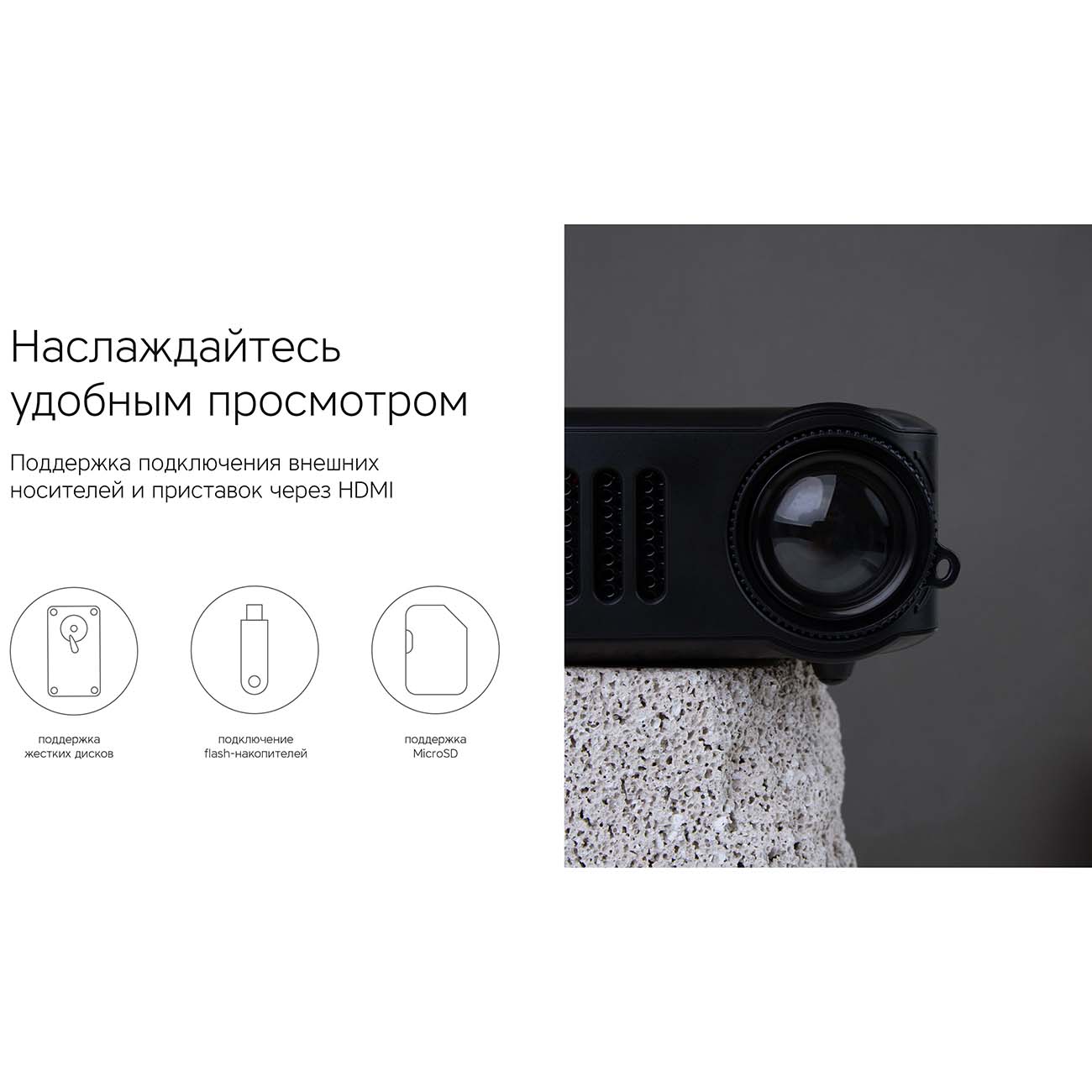 Маленький, аккуратный проектор. С кучей разъёмов. Включали вечером при мигающих гирляндах, изображение направили на обычные обои, сфокусировали и погрузились в просмотр фильма (подключали с ноутбука через HDMI). Звук чистый, не громкий, но чёткий и ясный (есть возможность подключения более мощной колонки, но мы не стали). Посмотрели фильм и пришли в восторг от созданной атмосферы. Его можно использовать в разных помещениях и на улице, направлять изображение куда угодно, хоть на потолок) Картинка будет больше и лучше, если использовать специальный экран (это следующая покупка) но и так малыш - проектор погрузил нас в таинственную атмосферу кинематографа. Если вы решили попробовать что такое проектор и решить нужно ли покупать его домой, это прекрасный вариант.