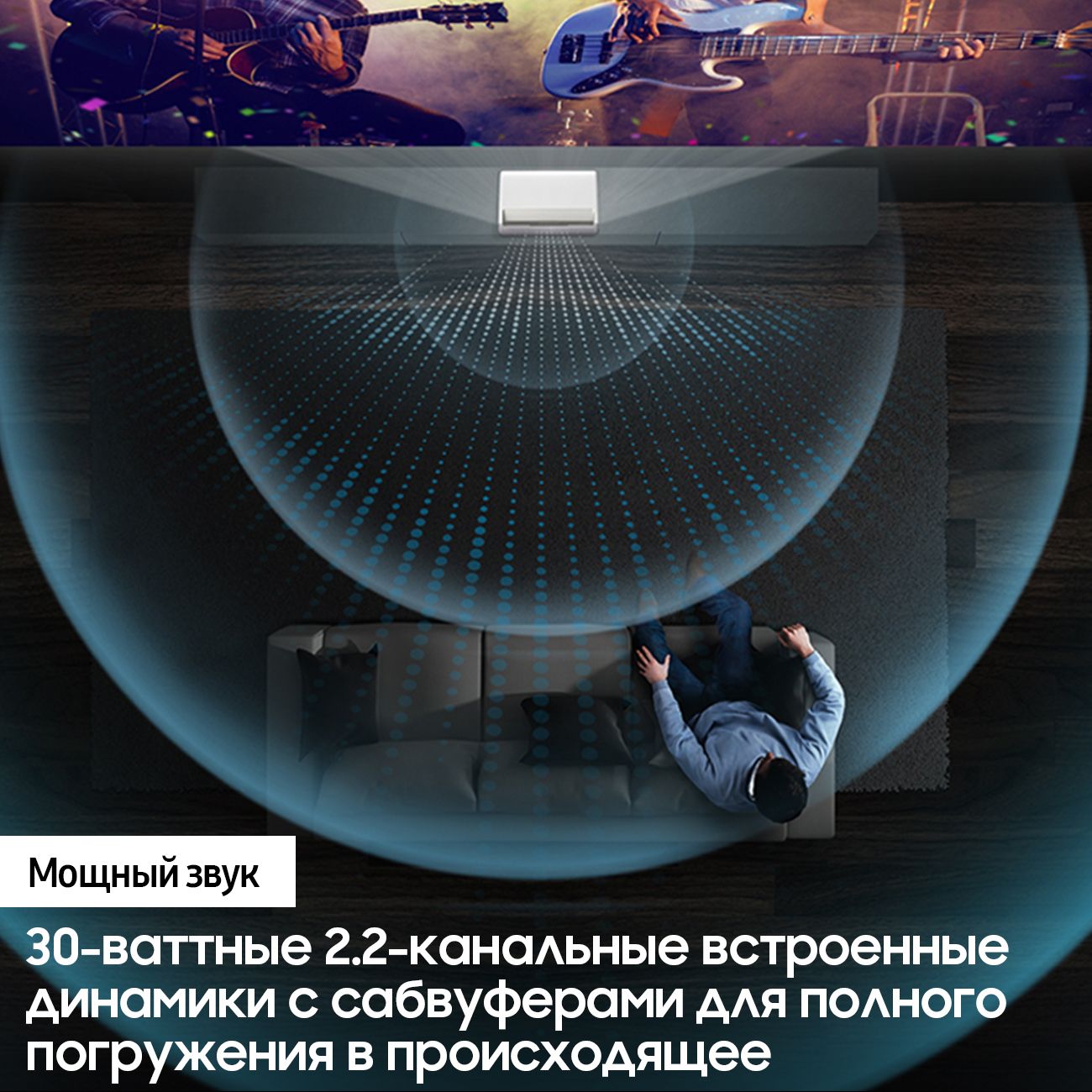 Встроенная 30-ваттная акустическая система, созданная по схеме 2.2, воспроизводит объёмный звук. Благодаря этому несложно представить себя в роли непосредственного участника событий, происходящих на экране перед вашими глазами, будь то футбольный матч или приключения в фантастическом мире будущего.