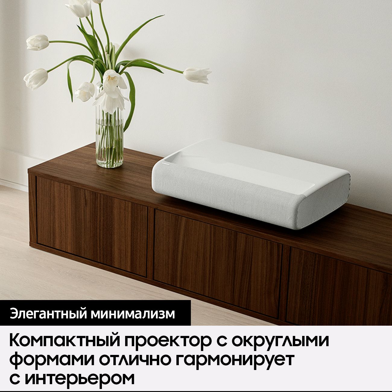 Дизайн устройства выдержан в духе элегантного минимализма. Девайс гармонично вписывается в современный интерьер, а ультракороткофокусный объектив позволяет размещать его поблизости от стены.