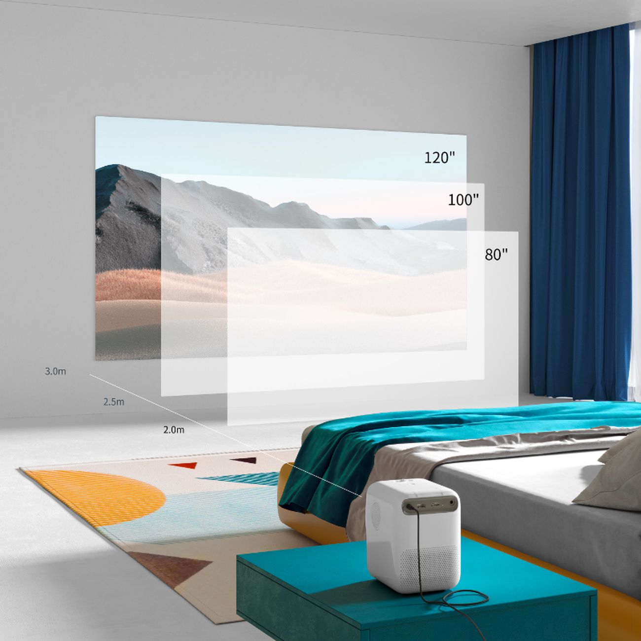 Имеет встроенную акустическую систему и поддерживает форматы 16:9 и 4:3. Максимальное и минимальное расстояние до экрана составляют 3 метра и 1,2 метра соответственно. Работает на операционной системе Android 9, встроенная память 16 ГБ, снабжен дистанционным управлением для удобства использования. Срок службы лампы составляет 20000 часов. Гарантия один год. Габаритные размеры 15x14x11 см. Страна-производитель — Китай.