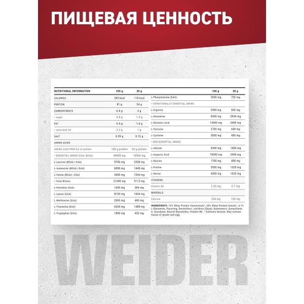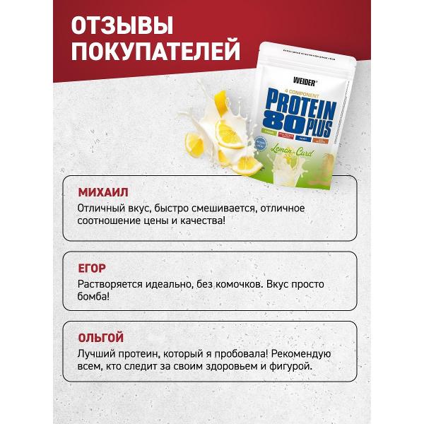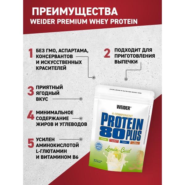 Протеин Weider Protein 80 Plus (30135) — многокомпонентная белковая смесь, разработанная для продолжительного насыщения организма аминокислотами. Комплексный продукт сочетает в себе различные виды высококачественных протеинов, обеспечивающих как мгновенное, так и пролонгированное питание мышечной ткани.