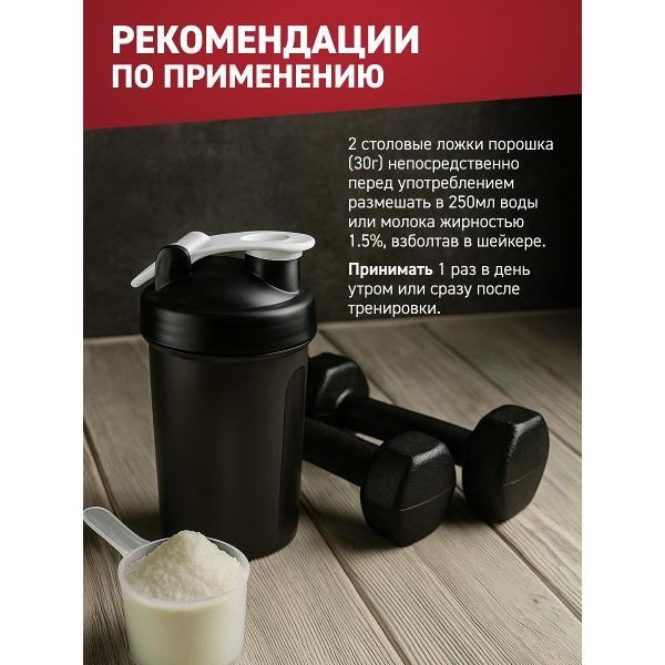 Для приготовления размешайте 30 г порошка (две мерные ложки) в 300 мл воды до получения однородной консистенции. Рекомендуется принимать один раз в день во время еды взрослым потребителям. Оптимальное время приема — вечером или в периоды длительного перерыва между приемами пищи, чтобы обеспечить непрерывное поступление аминокислот к мышцам. Протеин особенно подходит для тех, кто стремится к качественному мышечному росту и хочет максимально эффективно использовать периоды восстановления между тренировками.