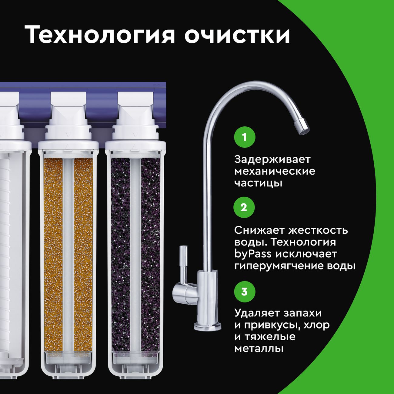 Тройная система фильтрации обеспечивает очистку от солей жёсткости и различных примесей, а также предотвращает образование накипи. Из воды удаляются ржавчина, песок и прочие механические частицы, соединения с участием кальция, магния и хлора, неприятные запахи и привкусы.