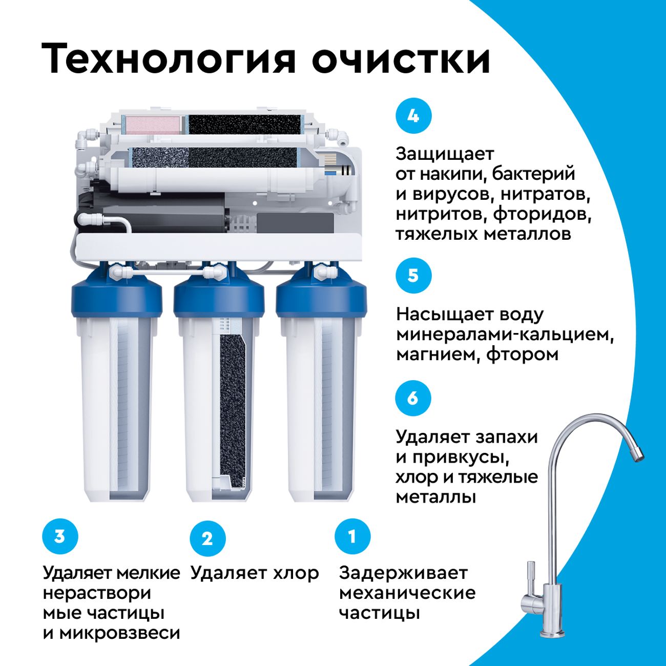 За счёт шестиступенчатого обратноосмотического механизма обработки вода из централизованной системы проходит глубокую очистку от хлора. Встроенный минерализатор дополнительно обогащает её полезными веществами: кальцием, магнием и фтором.