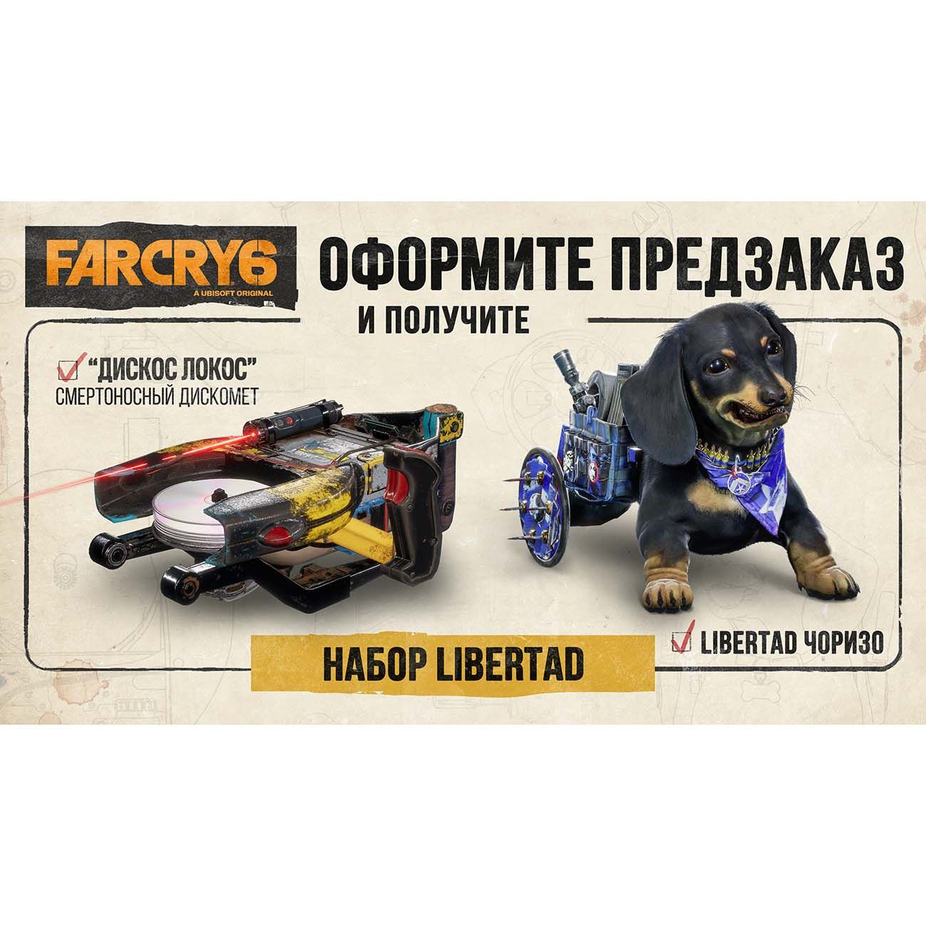 За предзаказ ты получишь набор Libertad. Его бонусы – это костюм для сопровождающей тебя собаки и скорострельный дискомёт Discos Locos.