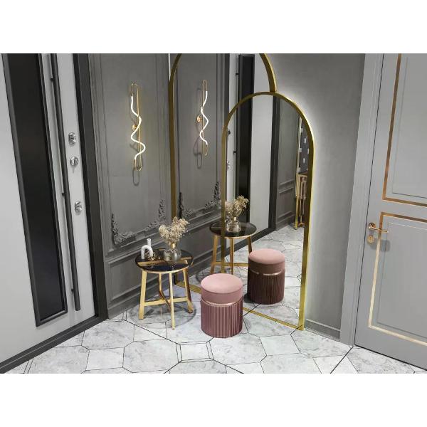 Отдельное внимание заслуживает использование пуфа для туалетного столика. В таком формате круглый пуфик с велюровой обивкой и ящиком для хранения обеспечивает удобную посадку во время ухода за собой, макияжа или укладки, сохраняя компактность и визуальную аккуратность интерьера.