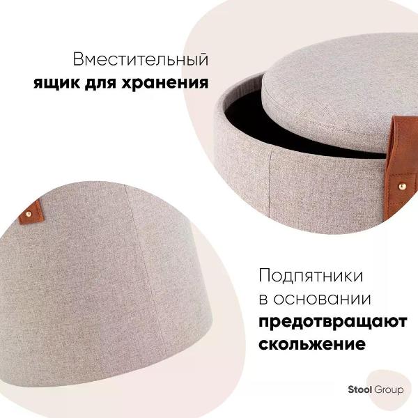 Мягкая обивка выполнена из рогожки - высокопрочный, устойчивый к истиранию и простой в уходе материал, отлично сочетается со вставками из дерева. Прочный каркас из фанеры не утяжеляет изделие и выдерживает нагрузку до 150 кг. Небольшие подпятники в основании пуфа защищают напольные покрытия от царапин и предотвращают скольжение.