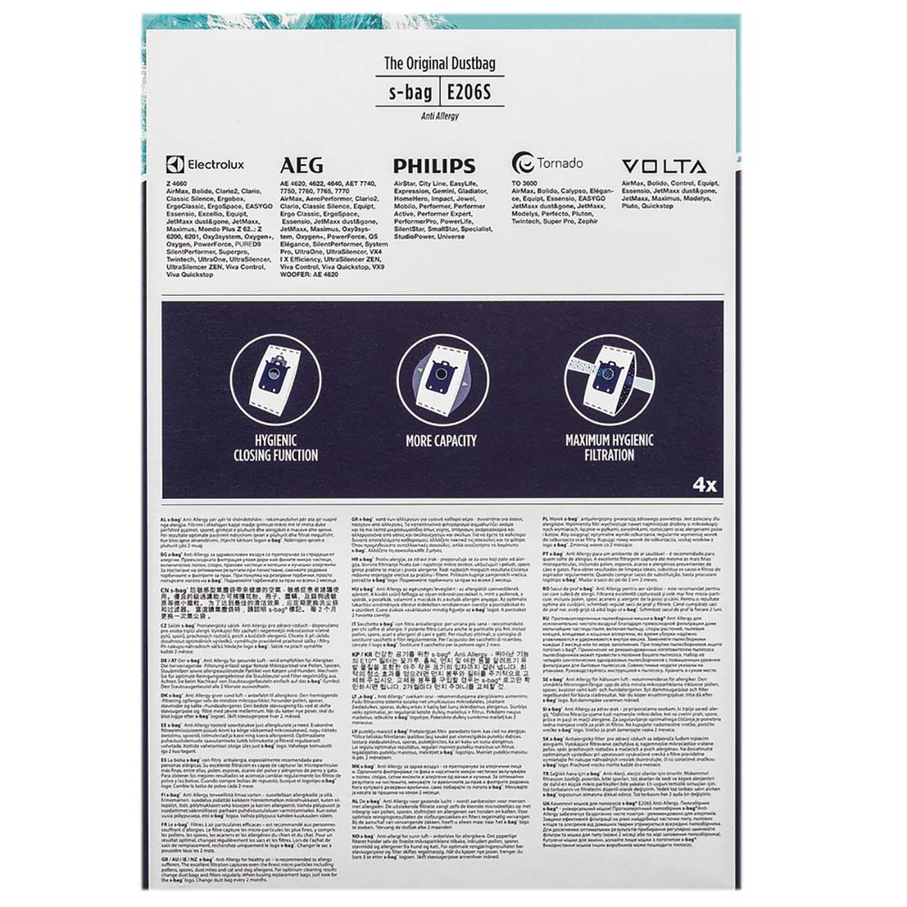 Пылесборник Electrolux E206S совместим с большинством моделей пылесосов таких брендов, как Electrolux, Philips, AEG, Tornado и Volta. В комплекте есть четыре мешка из особо прочного материала, благодаря которому они прослужат вам гораздо дольше обычных бумажных. Надёжный клапан плотно фиксирует аксессуар в специальном креплении и препятствует обратному выбросу сора.