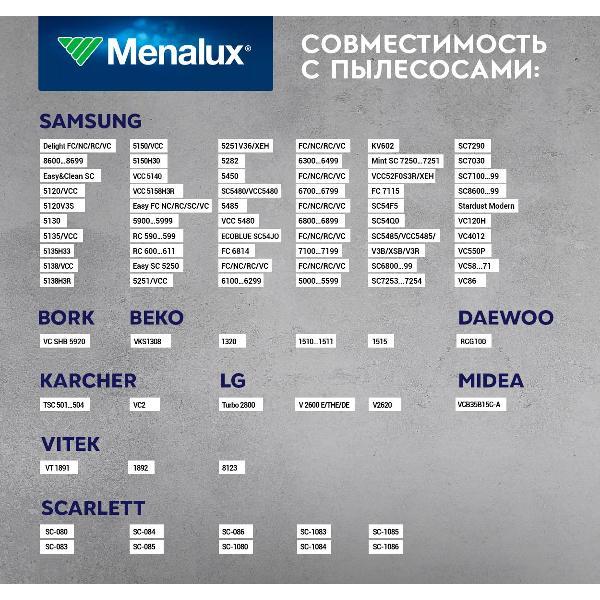 Оригинальные пылесборники Menalux 1840 - это одноразовые синтетические мешки типа VP-95B, а также типа VP-77 для пылесоса Samsung – идеальное решение для эффективной и гигиеничной уборки вашего дома.