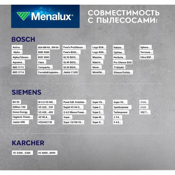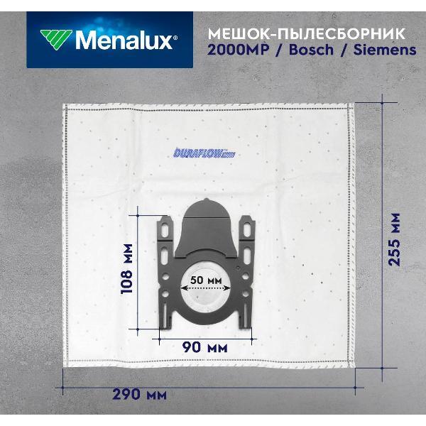 Пакеты для сбора пыли Menalux 2000 Duraflow Fresh подходят к пылесосам Bosch и Siemens мощностью 1800w, 2000w, 2100w, 2200w, 2400w, 2500w.