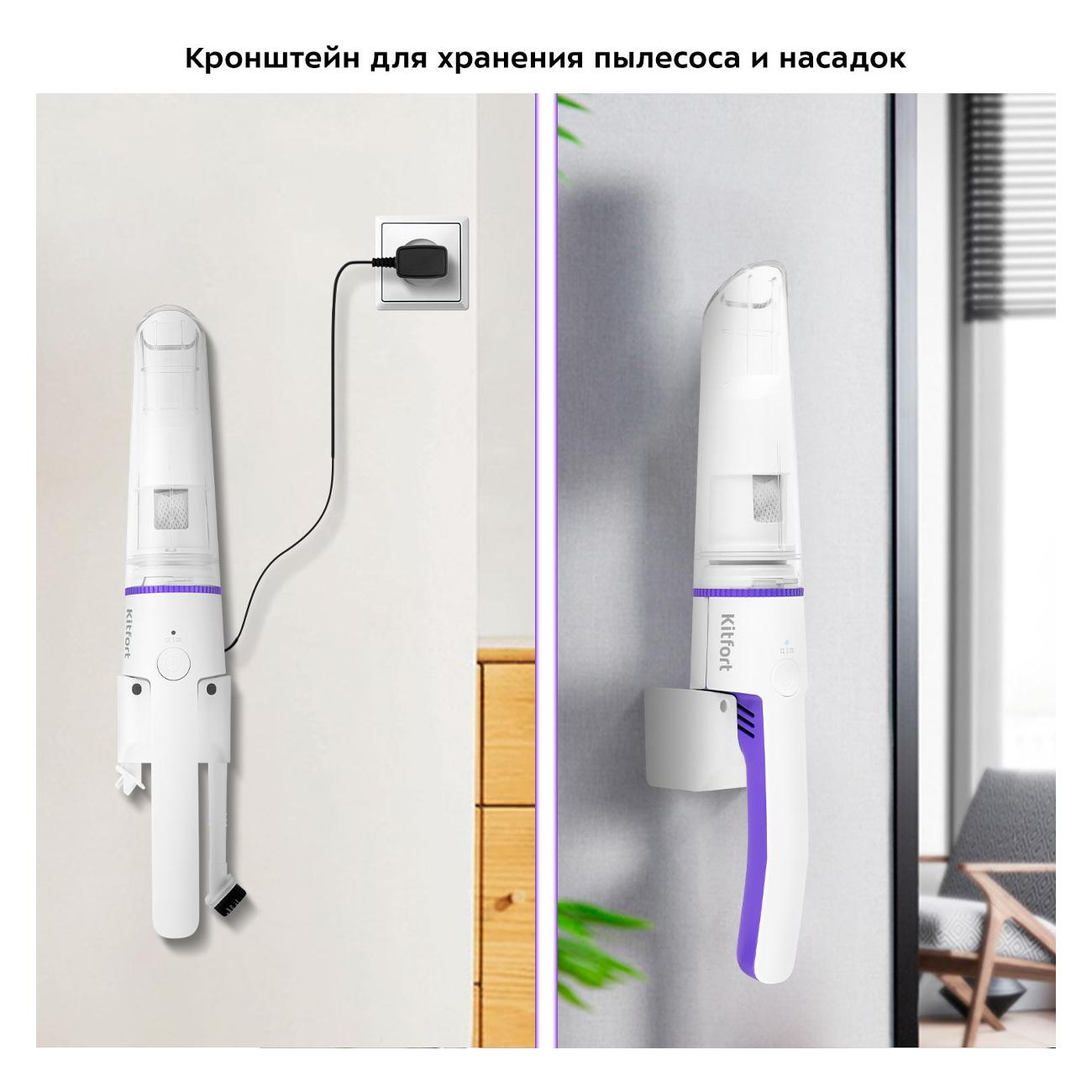 Для питания используется литий-ионный аккумулятор. Он обеспечивает до 25 минут непрерывной работы. Время зарядки составляет 5 часов. Рабочее напряжение равно 9,6 В. Предусмотрен сетевой 1,8-метровый шнур. В комплект входит кронштейн, который обеспечивает настенное хранение устройства. В его нижней части расположены специальные крепления, на которых можно разместить пару насадок. Размеры модели — 8,5х45х7,5 см, вес — 0,7 кг.