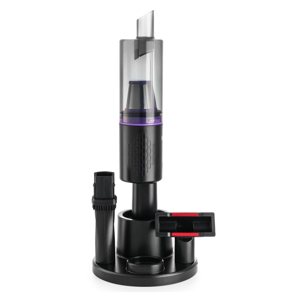 Для удобства зарядки и хранения пылесоса и аксессуаров к нему прилагается подставка. Емкость батареи составляет 2 А*ч, она восполняет ресурс примерно за 5 часов и предоставляет до 35 минут автономности. Точное время зависит от выбранного режима — их два. Уровень шума не превышает 74 дБ. Управление производится при помощи одной кнопки, предусмотрен световой индикатор включения.