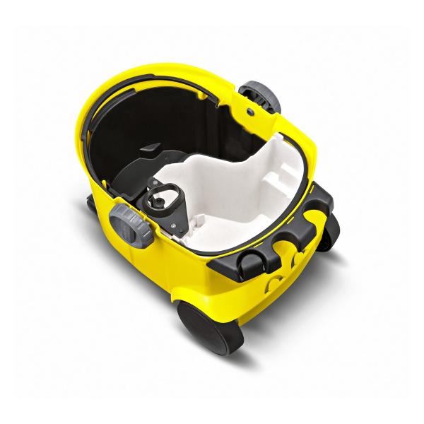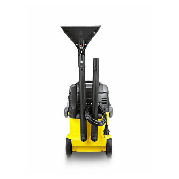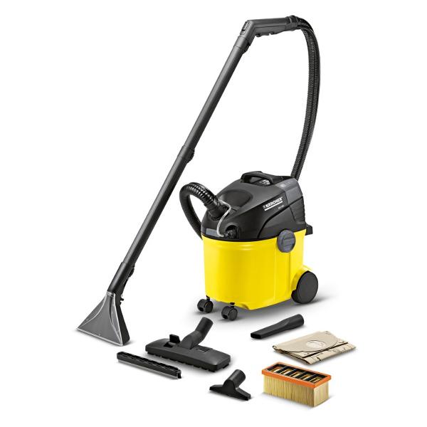 Пылесос моющий Karcher SE 5.100 мощностью 1400 Вт наделен функциями сухой и влажной уборки твердых напольных покрытий, ковров, текстильных поверхностей. Модель в классическом корпусе из ударопрочного пластика габаритами 470x290х370 мм оснащена бумажным фильтр-мешком и баком для чистой воды объемом 5 л. Для сбора загрязненной жидкости предназначен внутренний отсек корпуса объемом 6 л. Четыре маневренных колеса обеспечивают бесшумное перемещение корпуса по напольным покрытиям. Перекидная рукоятка упрощает перенос модели и слив загрязненной воды.
