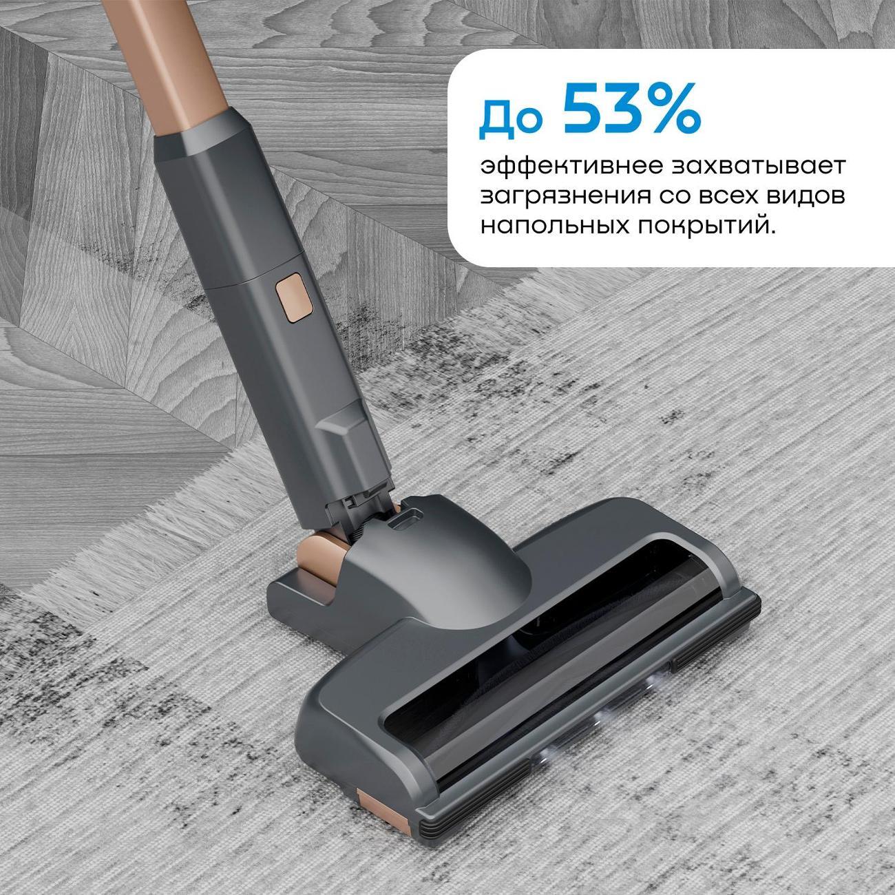 Система фильтрации AeroCyclone7 многоступенчатая, фильтр тонкой очистки HEPA13 удерживает до 99,99% мельчайшей пыли и не дает ей проникнуть обратно в помещение вместе с выдуваемым воздухом. Фильтр предварительной очистки удерживает более крупные частицы и защищает мотор. Все фильтры снимаются, их можно промывать под проточной водой. Автономную работу обеспечивает литий-ионный аккумулятор, потребляемая мощность — 240 Вт. Уровень шума не превышает 72 дБ. Габаритные размеры пылесоса: 109х24х24 см, вес — 2,6 кг.