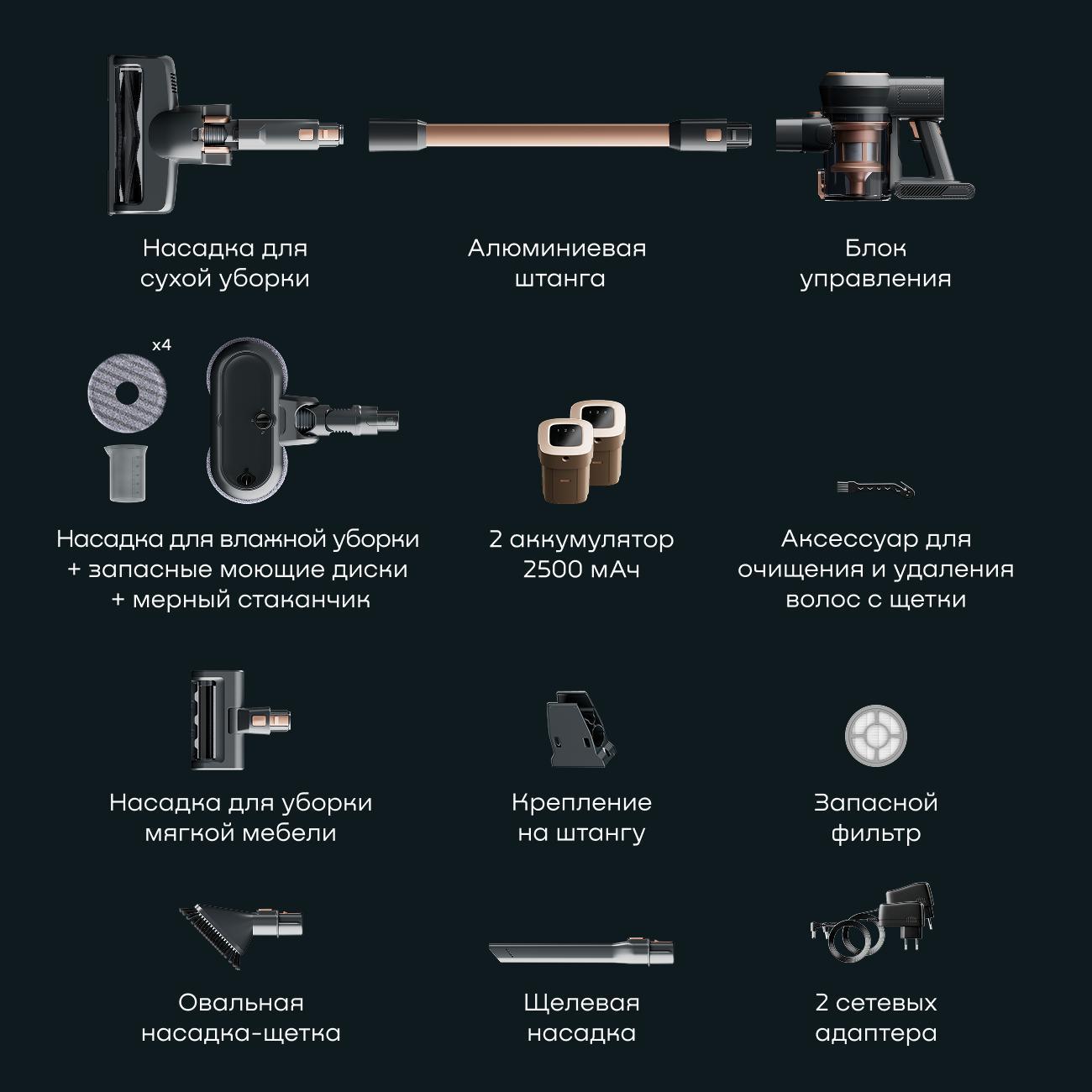 Моющая насадка AquaDrive оборудована независимым мотором. Он отвечает за вращение круглых щеток, они совершают 120 об/мин и эффективно устраняют любые загрязнения. Насадка MotorHead Turbo также моторизирована (20 Вт), ее роликовая щетка вращается со скоростью 7800 об/мин и эффективно собирает мусор и с гладких покрытий, и с ковров. Встроенная светодиодная подсветка помогает не пропустить ни соринки. Насадка MotorHead Vibro разработана для чистки мягкой мебели и других текстильных покрытий: благодаря особым вибрациям она выбивает загрязнения. Кроме того, в комплект входят овальная щетка, щелевое сопло для труднодоступных мест и гибкая насадка FlexyLong. Сила всасывания достигает 24000 Па.