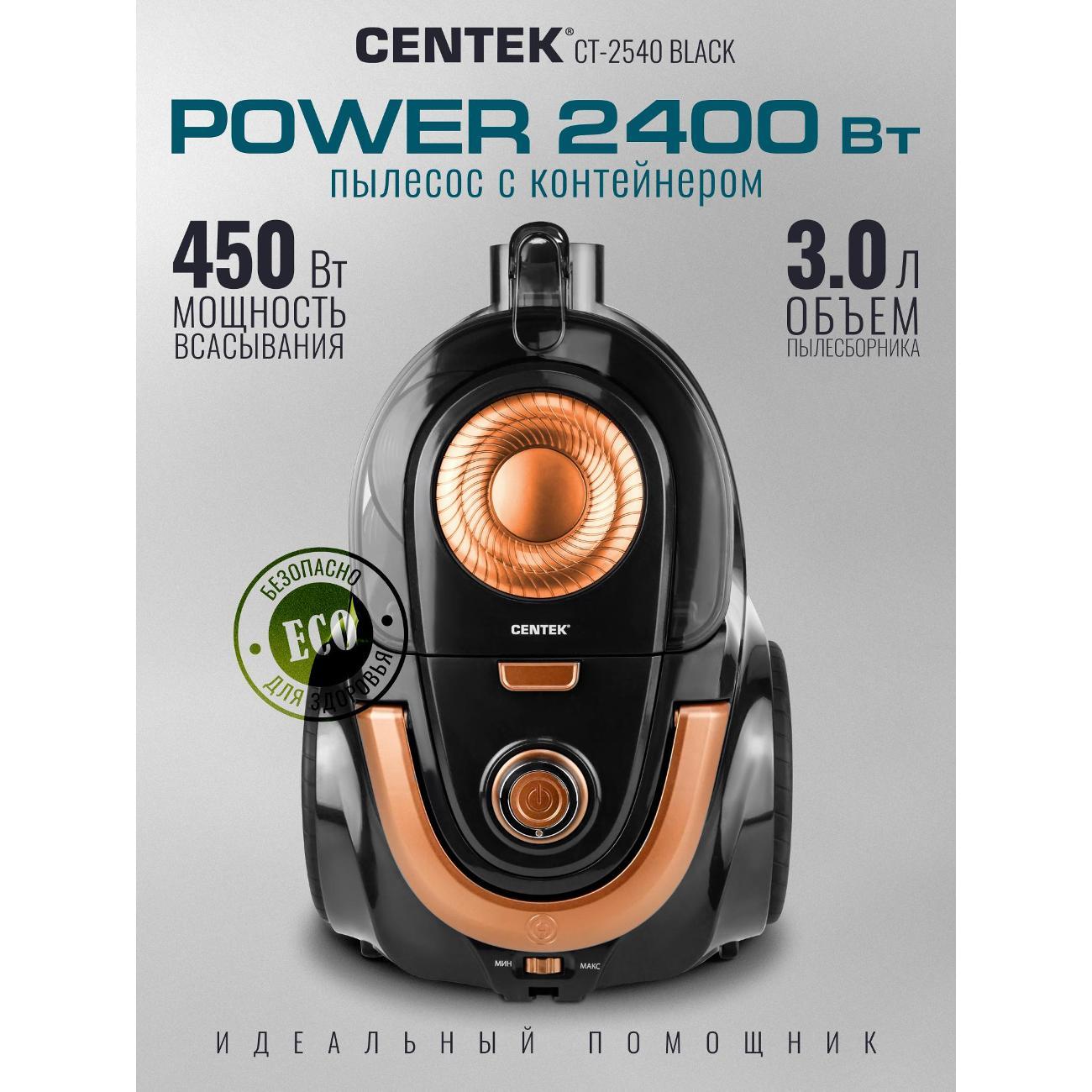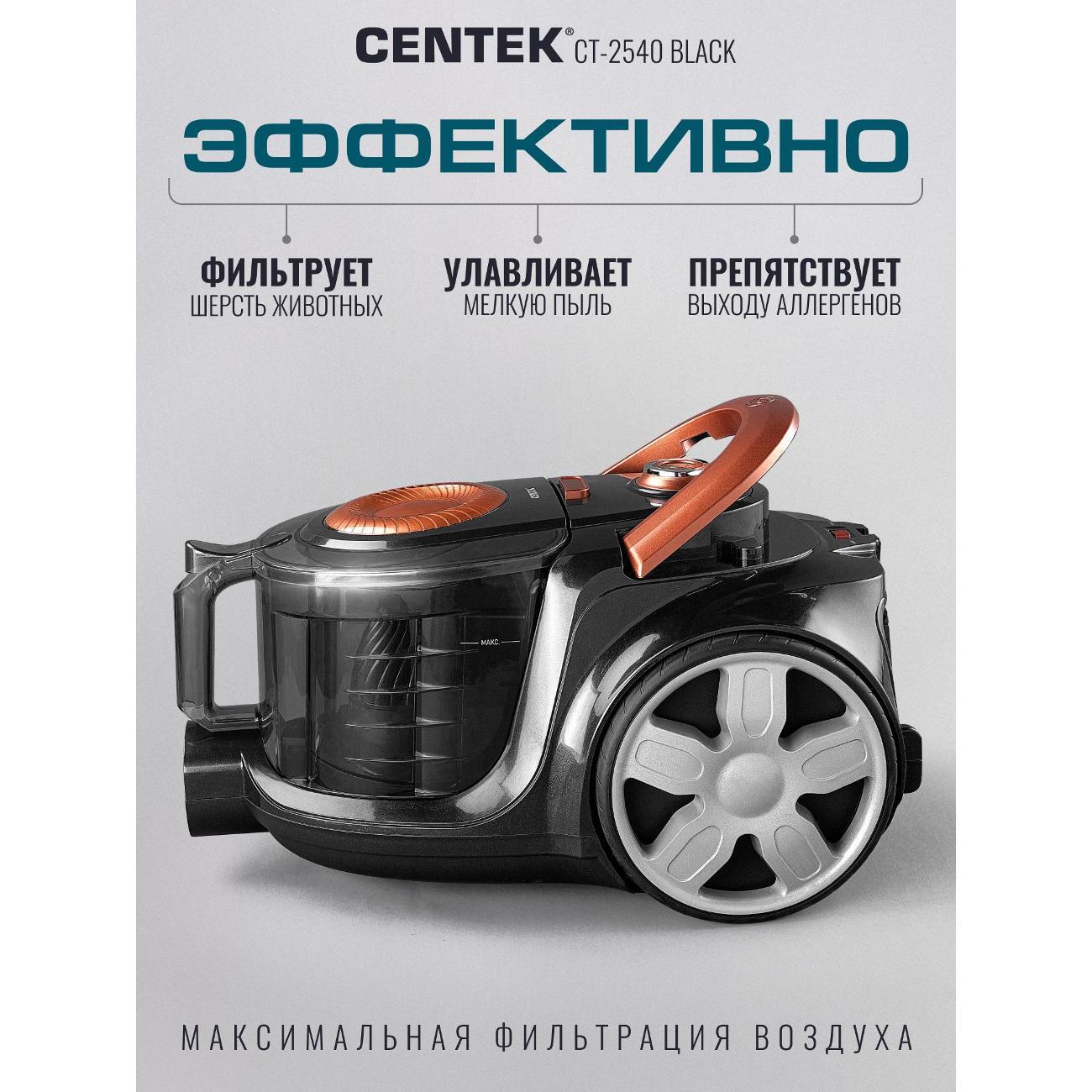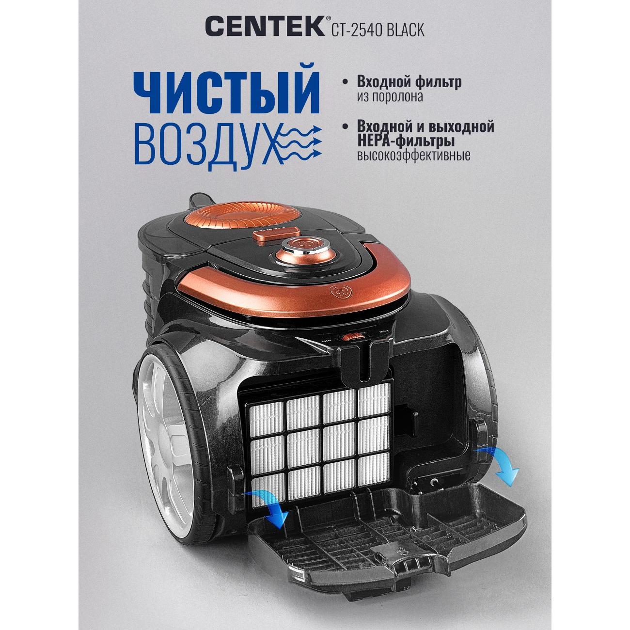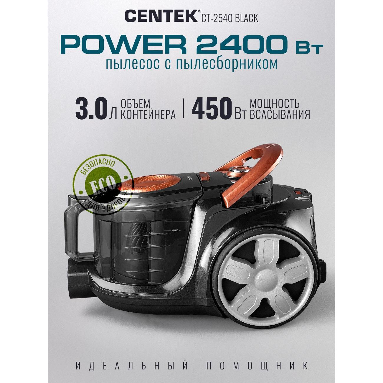 Легкий и маневренный пылесос Centek CT-2540 – практичное решение для уборки в помещении. Его мощности всасывания (450 Вт) хватает для глубокой и эффективной чистки ковров и твердых напольных покрытий. Благодаря эргономичной противоскользящей ручке, удобно и надежно лежащей в руке, и металлической хромированной телескопической трубе вы можете с легкостью контролировать движение, не утомляясь и не рискуя выронить ее из рук. Объём контейнера — 3 л, что позволяет убирать большие площади без частой очистки. Двойной HEPA фильтр задерживает до 99,9 % мельчайших частиц, включая аллергены и пыльцу. Воздух после уборки становится чище. Плавный запуск двигателя снижает нагрузку на мотор и продлевает срок службы устройства. Противоскользящая ручка удобно лежит в руке, а три колеса повышают манёвренность. Сетевой кабель длиной с автоматическим сматыванием даёт свободу передвижения и позволяет охватить большую площадь без переключения розеток. Centek CT 2540 подойдёт для тех, кто ищет надёжный и мощный пылесос для дома. Модель оптимальна для семей с детьми и домашними животными: она эффективно убирает шерсть и пыль, очищает воздух и удобна в эксплуатации. Centek CT 2540 — практичный выбор для домашнего использования для тех, кто ценит надёжность, долговечность и удобство эксплуатации. Приобретая пылесос для дома с контейнером мощный CENTEK CT-2540 вы оцените преимущества современной технологии уборки. Надёжная конструкция, продуманная эргономика и высокая эффективность — всё для комфортной уборки вашего дома.