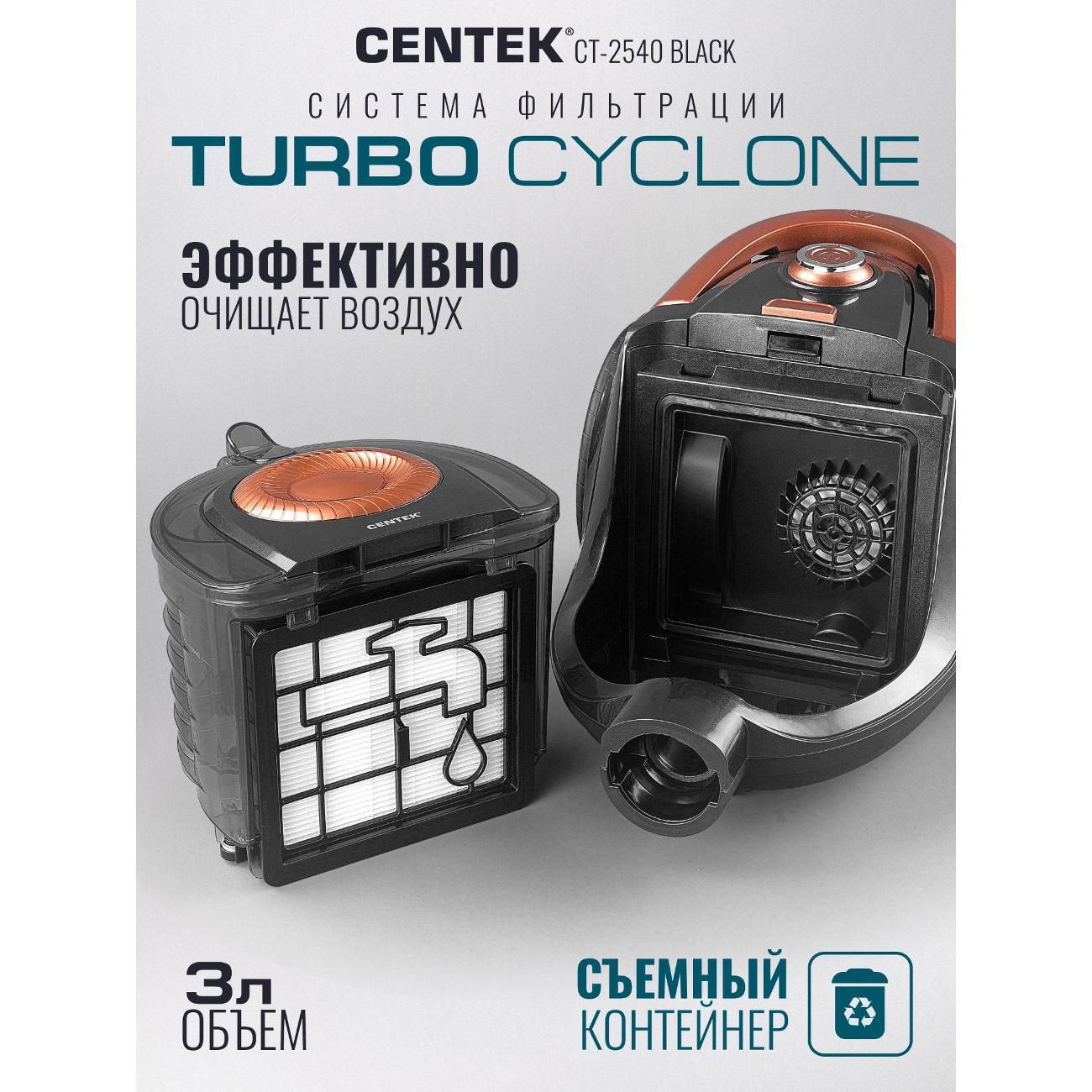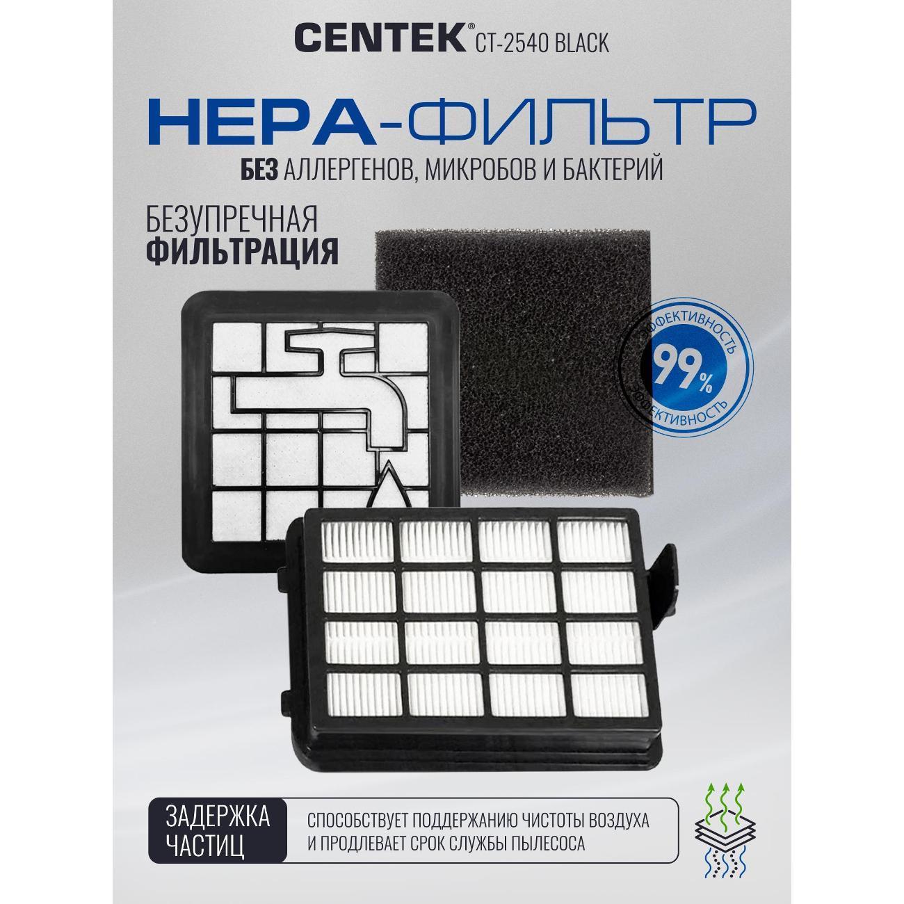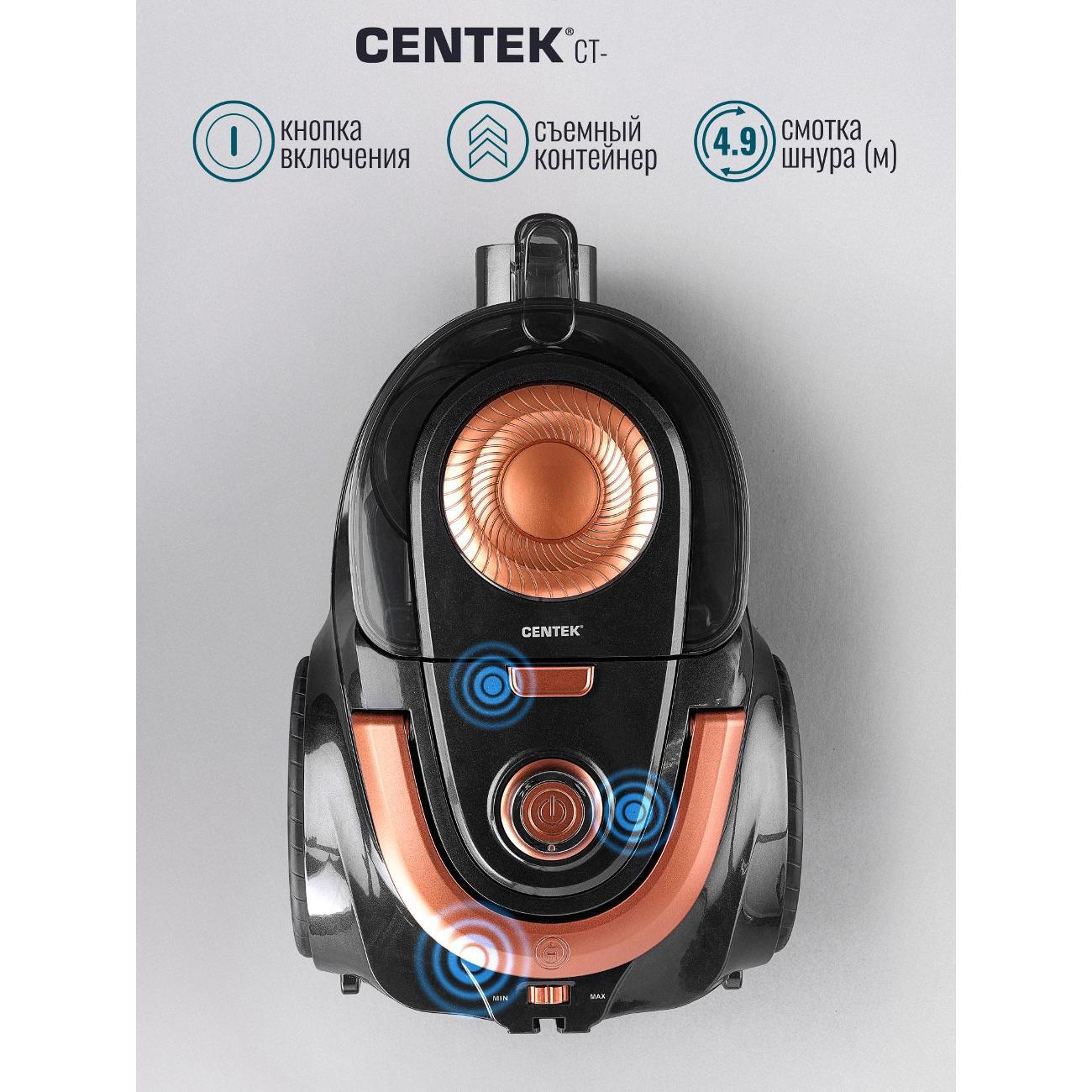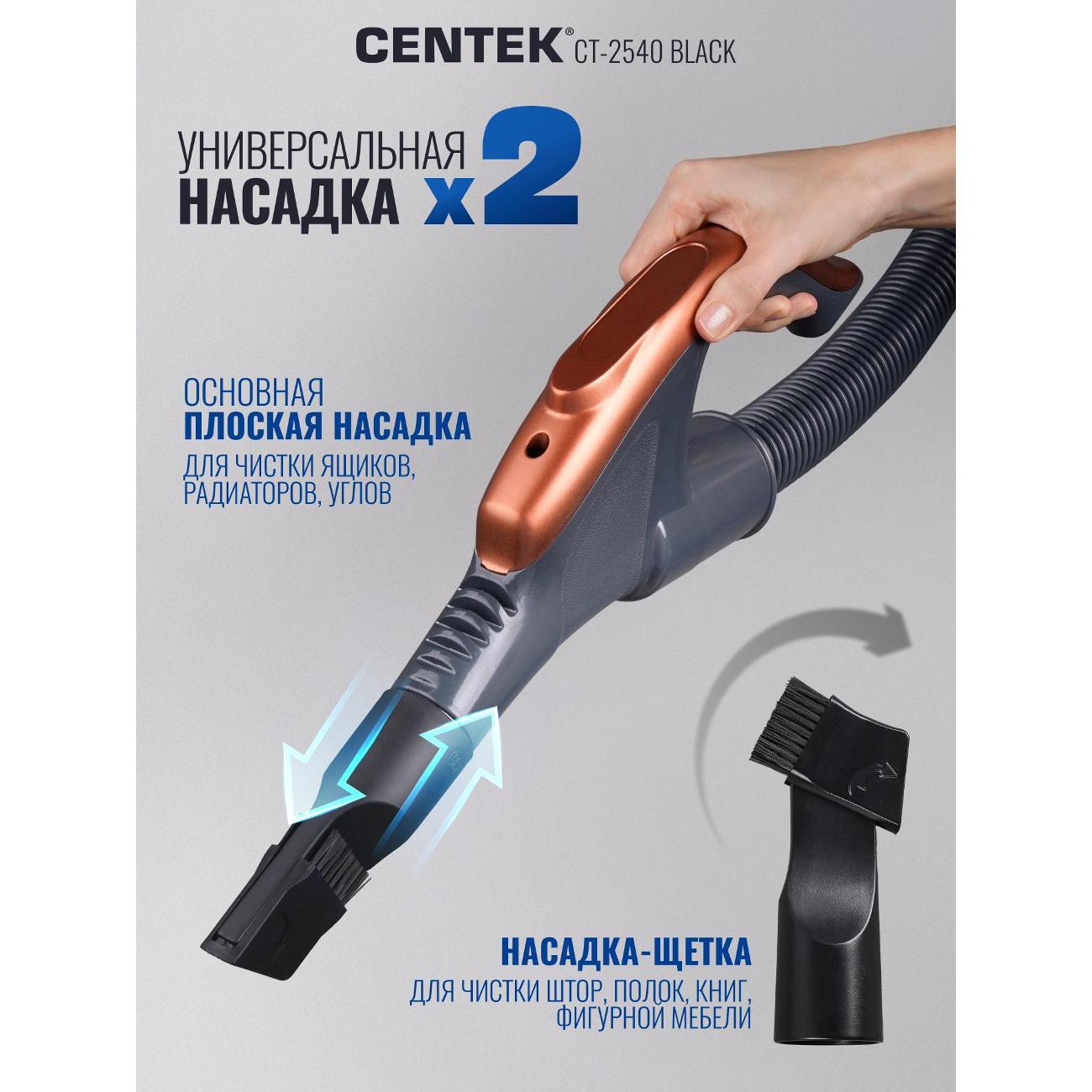 Легкий и маневренный пылесос Centek CT-2540 – практичное решение для уборки в помещении. Его мощности всасывания (450 Вт) хватает для глубокой и эффективной чистки ковров и твердых напольных покрытий. Благодаря эргономичной противоскользящей ручке, удобно и надежно лежащей в руке, и металлической хромированной телескопической трубе вы можете с легкостью контролировать движение, не утомляясь и не рискуя выронить ее из рук. Объём контейнера — 3 л, что позволяет убирать большие площади без частой очистки. Двойной HEPA фильтр задерживает до 99,9 % мельчайших частиц, включая аллергены и пыльцу. Воздух после уборки становится чище. Плавный запуск двигателя снижает нагрузку на мотор и продлевает срок службы устройства. Противоскользящая ручка удобно лежит в руке, а три колеса повышают манёвренность. Сетевой кабель длиной с автоматическим сматыванием даёт свободу передвижения и позволяет охватить большую площадь без переключения розеток. Centek CT 2540 подойдёт для тех, кто ищет надёжный и мощный пылесос для дома. Модель оптимальна для семей с детьми и домашними животными: она эффективно убирает шерсть и пыль, очищает воздух и удобна в эксплуатации. Centek CT 2540 — практичный выбор для домашнего использования для тех, кто ценит надёжность, долговечность и удобство эксплуатации. Приобретая пылесос для дома с контейнером мощный CENTEK CT-2540 вы оцените преимущества современной технологии уборки. Надёжная конструкция, продуманная эргономика и высокая эффективность — всё для комфортной уборки вашего дома.