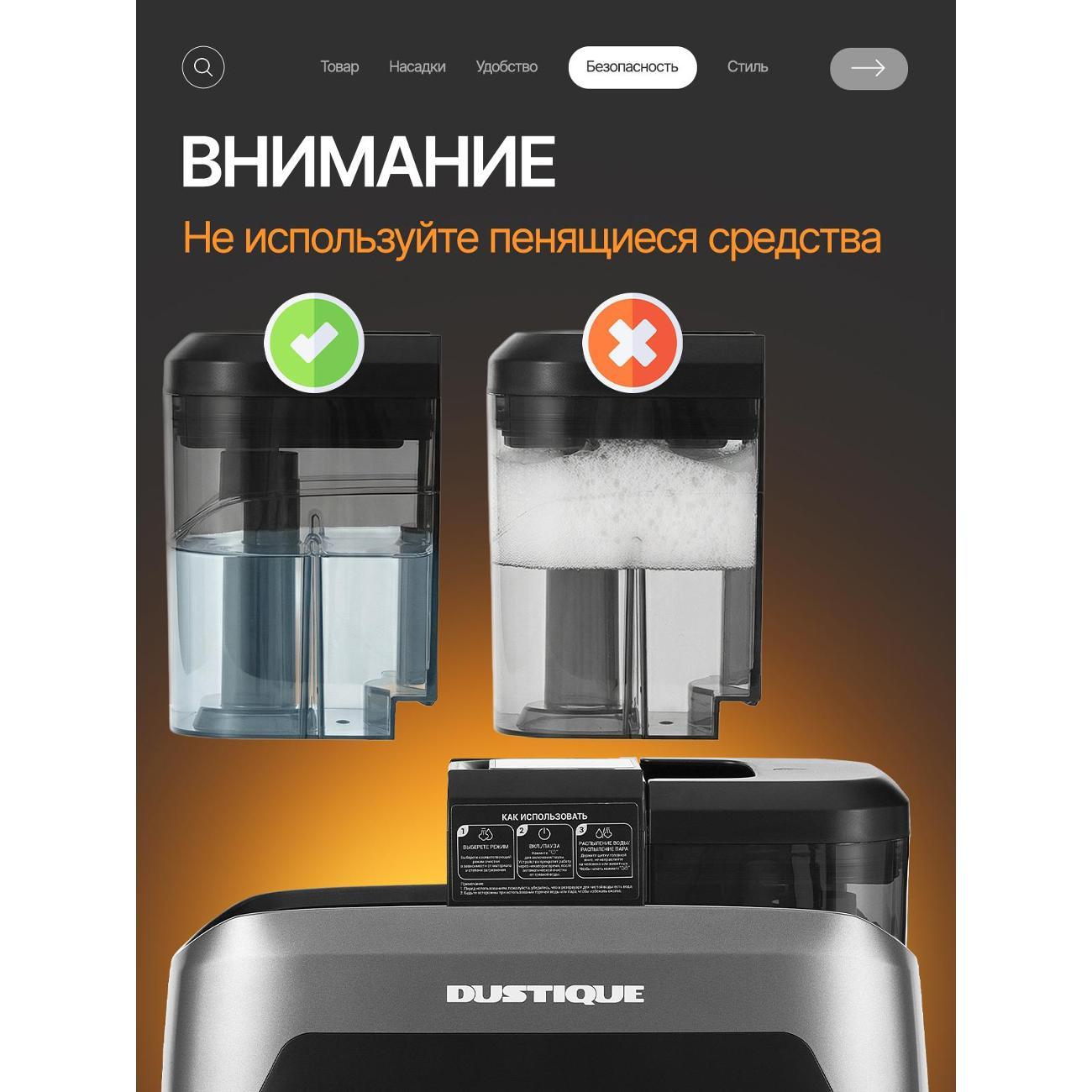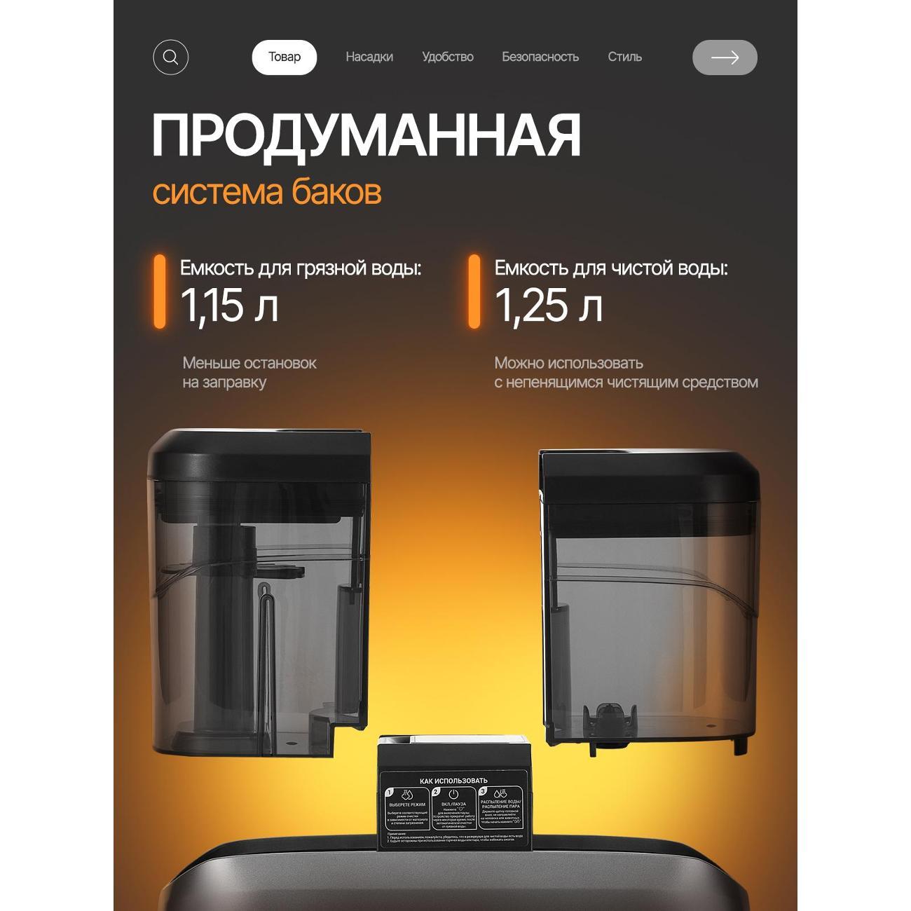 Резервуар для чистой воды объёмом 1250 мл и ёмкость для сбора грязной воды на 1150 мл обеспечивают продолжительную уборку без частых перерывов. Поддерживаются режимы работы с холодной и горячей водой, пар с одновременным всасыванием, а также подача пара без вакуума. Такой набор режимов подходит для обработки напольных покрытий, ковров, мебели, стекла, плитки и кафеля.