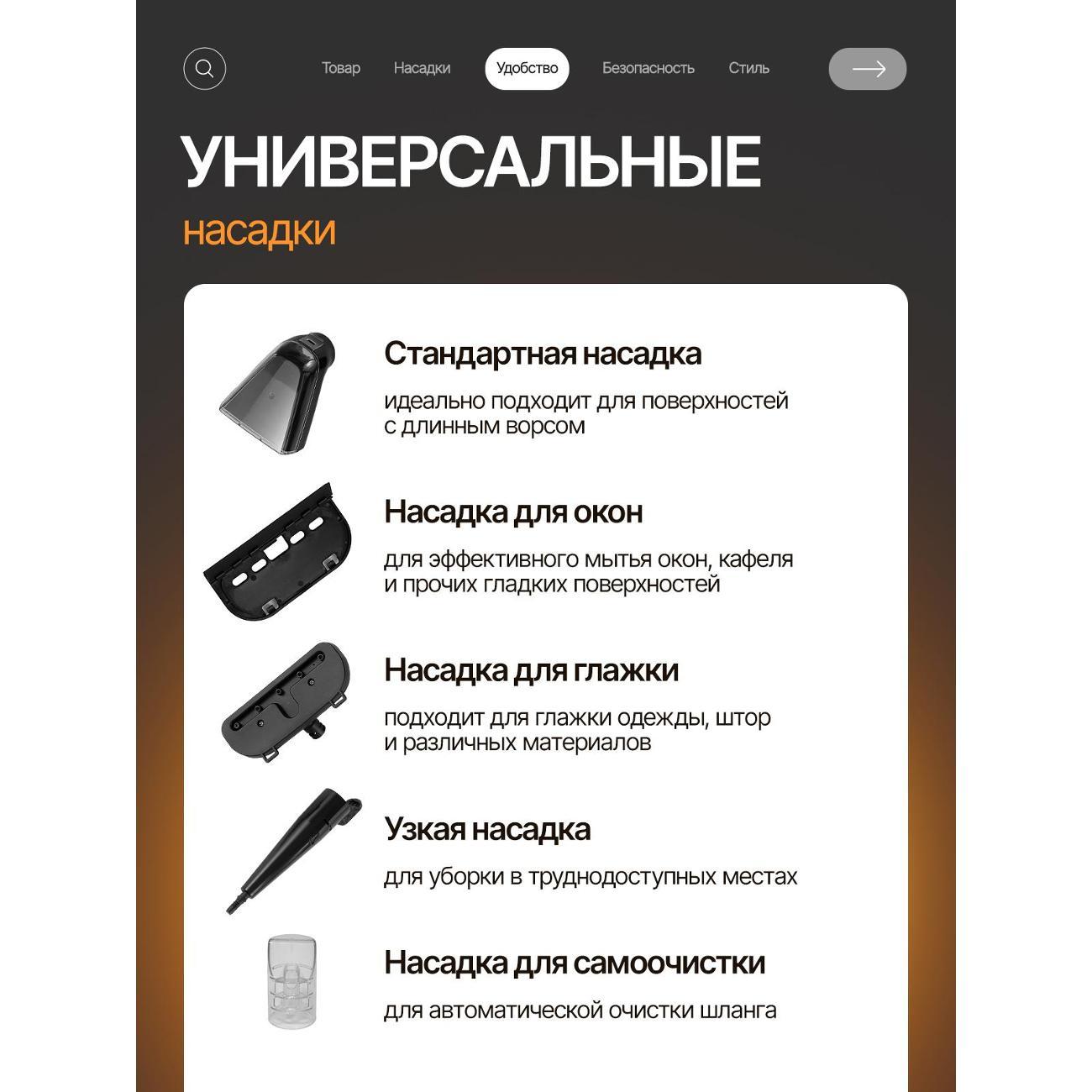 В комплект входят паровая щётка, удлинённый шланг, насадки для глажки и мытья окон, узкая паровая насадка для труднодоступных участков, чистящая салфетка, а также крепления для шланга и держатель для рукоятки. Конструкция аксессуаров упрощает хранение и организацию рабочего пространства.