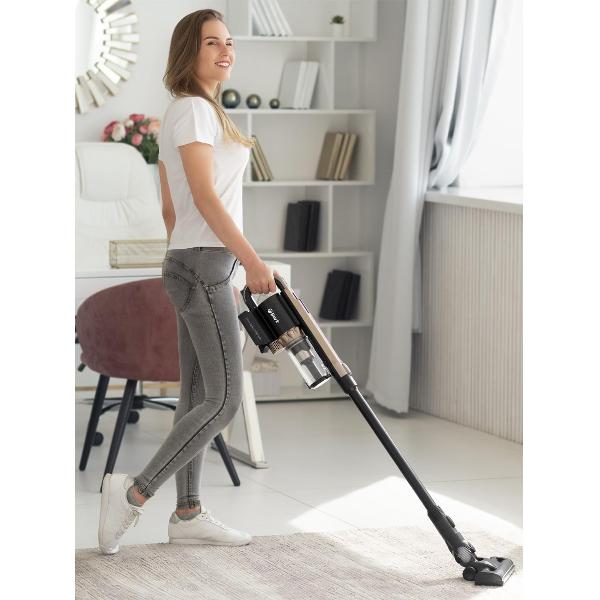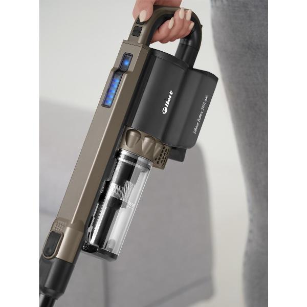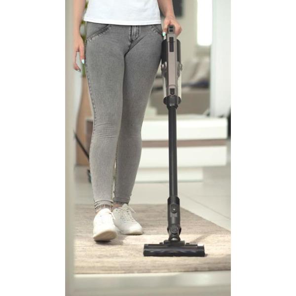 Для сбора мусора используется циклонический контейнер объемом 500 мл. Фильтр HEPA эффективно задерживает мельчайшие частички пыли и обеспечивает чистый воздух на выходе. Электронные кнопки управления расположены на рукояти. Трубку можно отсоединить, чтобы очистить от загрязнений салон автомобиля, мягкую мебель или труднодоступные места.