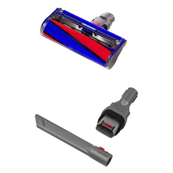 Тип трубки — цельная. В комплекте семь насадок: с высоким крутящим моментом, с мягким валиком, щелевая, электрощетка-мини, щетка с жесткой щетиной и с мягкой щетиной, насадка для мягкой и корпусной мебели. Также в комплекте есть клипса для крепления насадок к трубе.