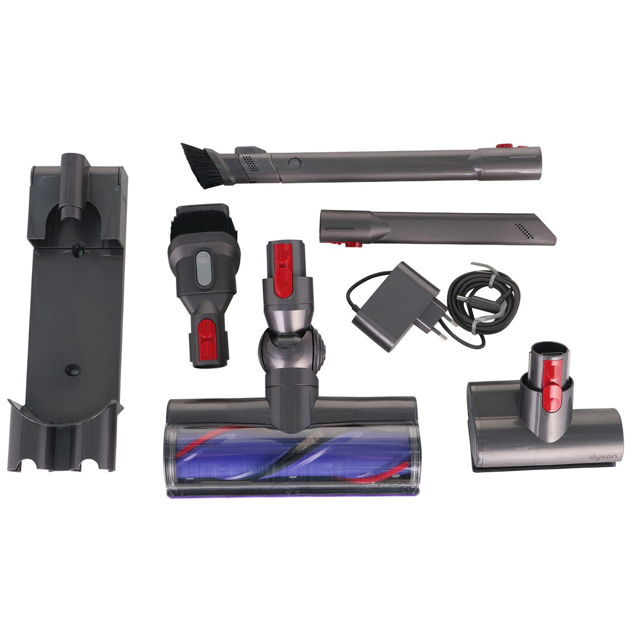 Пять съемных насадок входят в комплект: щелевая стандартная, выдвижная щелевая, электрощетка мини, электрощетка стандартная, насадка-щетка для мягкой и корпусной мебели. Также модель комплектуется зарядным устройством с длиной сетевого шнура 1,8 м.