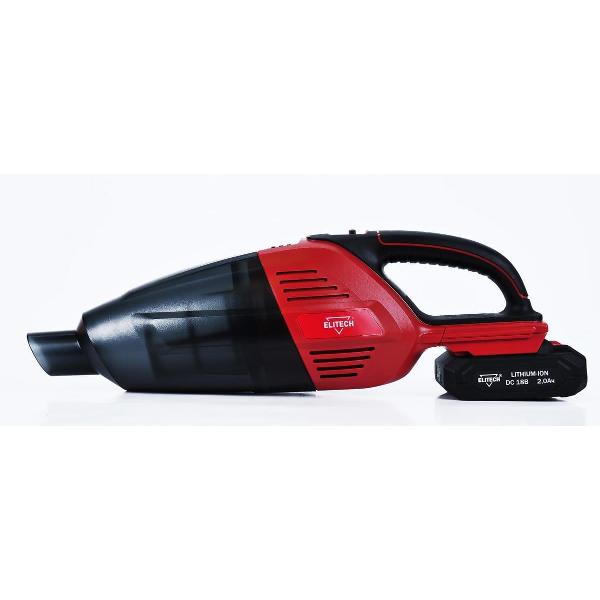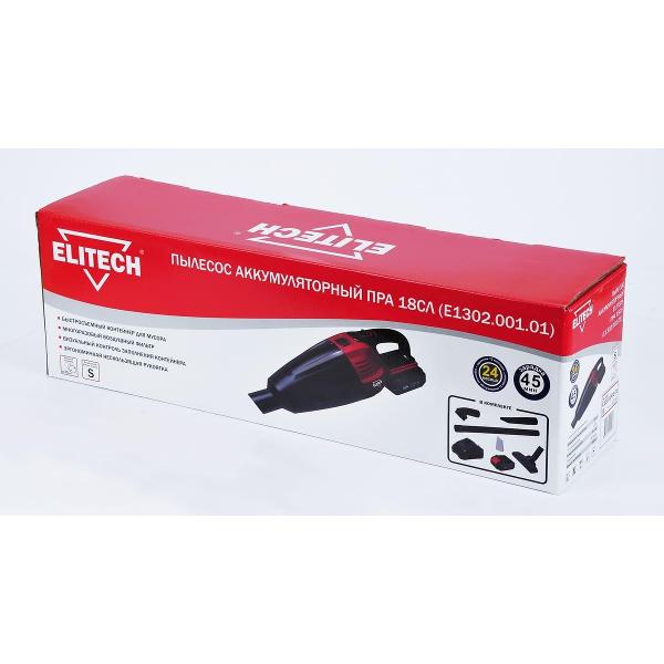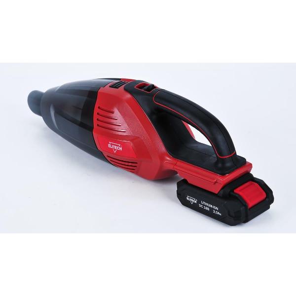 Ручной пылесос Elitech ПРА 18СЛ Red осуществляет сухую уборку помещения при мощности 34 Вт. Аккумулятор типа Li-Ion емкостью 2 мА*ч заряжается от сети 220 В за 45 мин. Работа от аккумулятора возможна в течение 20 мин, при этом уровень шума достигает 76 дБ. Рабочее напряжение составляет 18 В.