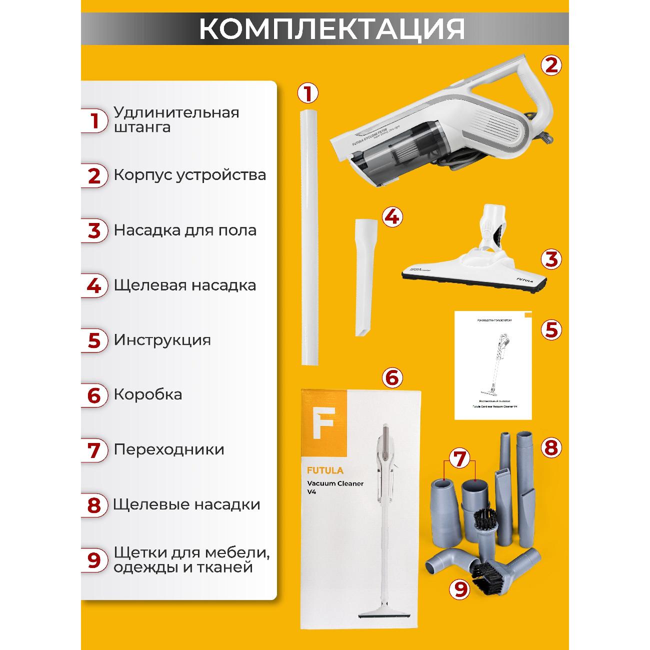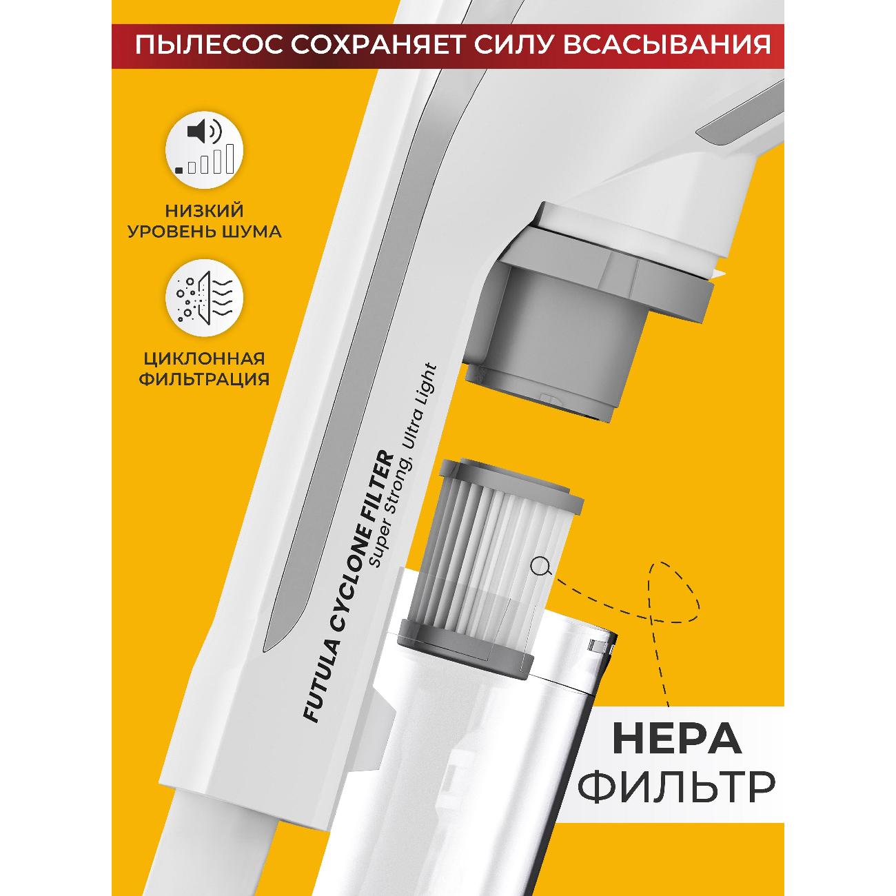 Ручной пылесос Futula V4 White оснащен двигателем мощностью 650 Вт с функцией плавного запуска. В режиме сухой уборки используются две скорости в зависимости от типа покрытия пола. Электропитание осуществляется от сети. Этого количества энергии достаточно для 35 мин беспрерывной работы. В качестве пылесборника используется контейнер с циклоническим фильтром, благодаря которому воздух движется по спирали, и под воздействием центробежной силы пыль сбивается в плотный комок.