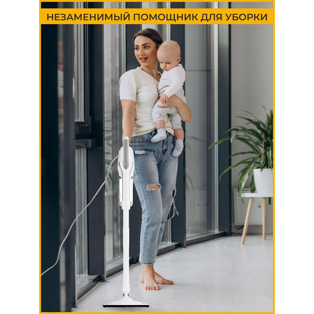 Конструкция устройства включает пластиковый корпус с цельной трубкой, креплением на стену и возможностью вертикальной парковки. Данная модель дополнена индикатором режима работы. За безопасную эксплуатацию отвечает функция отключения при перегреве. Комплект включает подставку для вертикальной установки и удлинитель составной трубки.